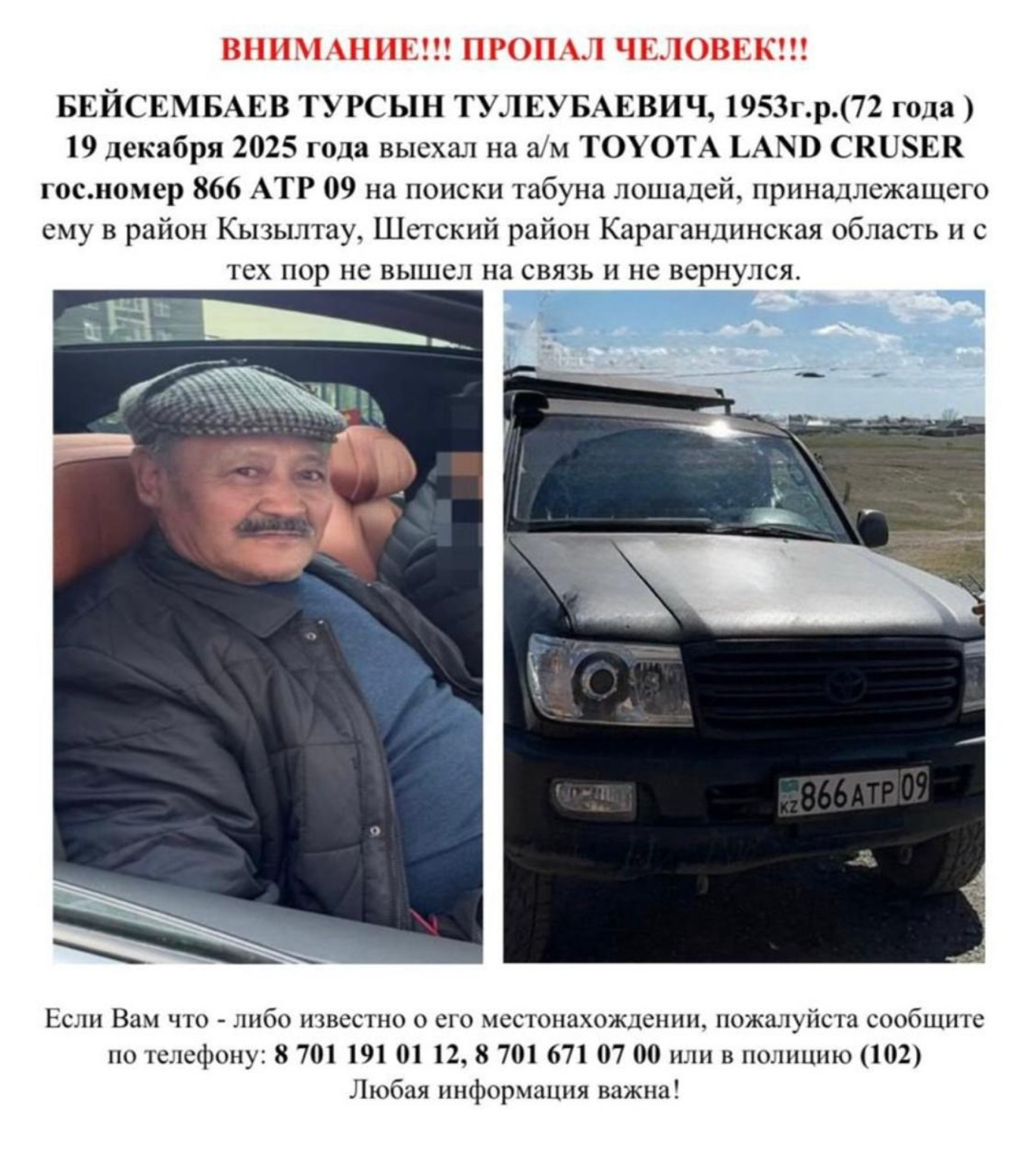 В Шетском районе Карагандинской области в степной зоне обнаружили автомобиль, внутри которого находилось тело 72-летнего мужчины. Пенсионера разыскивали несколько суток — в поисках были задействованы спасатели и волонтёры, передаёт корреспондент Tengrinews.kz.