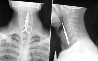 Китайские хирурги из города Путянь спасли жизнь мужчины, случайно проглотившего девяти-сантиметровые маникюрные ножницы, сообщает Telegraph. 27-летний Лин Кон (Lin Kong) одолжил у своего друга ножницы, чтобы воспользоваться ими в качестве зубочистки. Знакомый Кона рассказал ему шутку, в то время когда тот чистил зубы. Кон рассмеялся, ножницы выскользнули у него из рук и провалились прямо в горло. Рентгеновский снимок показал, что ножницы полностью дошли до пищевода. Хирурги смогли оперировать только под местным наркозом, так как общий наркоз расслабил бы мышцы мужчины, и прибор провалился бы глубже. Вся операция заняла 30 минут. Врачи многих стран часто извлекают из желудков пациентов различные предметы. Медики из научно-медицинского центра университета Теннесси обнаружили в желудке пациентки целую "копилку". Один из ее родственников сообщил, что она проглотила несколько монеток. В результате операции специалисты обнаружили 585 пенни, 17 монет в пять центов, 12 монет в десять центов, восемь монет в 25 центов и одну немецкую марку.