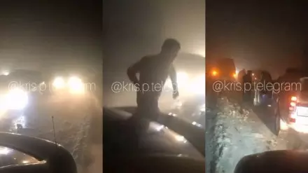 На кадрах видно, как на окутанной густым туманом дороге стоят не менее десятка автомашин, включив аварийную сигнализацию. Люди вышли из машин и не понимают, что происходит.