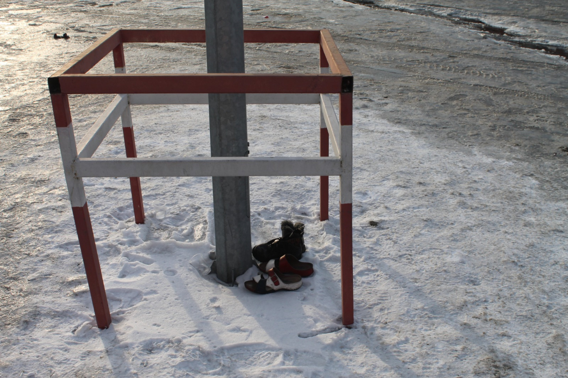 Рядом с одним из столбов на льду лежит детская обувь и пара шлёпок, предположительно, сотрудников.