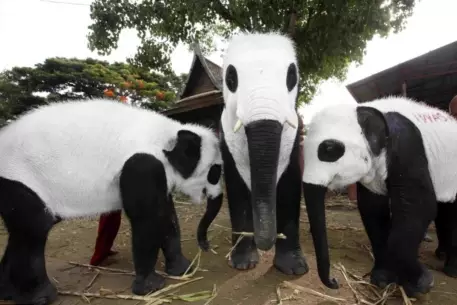 В зоопарке Royal Elephant Kraal в провинции Аюттхая (Ayutthaya) в 80 километрах к северу от Бангкока, устроили парад слонов, раскрашенных в черно-белый цвет. Парад проходил под лозунгом "Как жаль, что я не панда!".