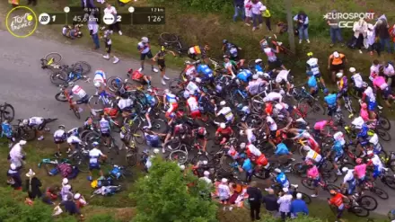 По данным Sport.24tv, больше всего пострадали словенец Примож Роглич и бельгиец Ваут Ван Арт из команды Jumbo-Visma, которые одними из первых попали в завал.