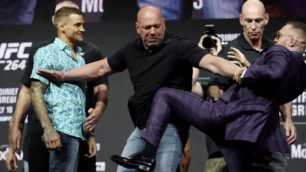 На битве взглядов Макгрегор сначала встал в стойку, а затем попытался неожиданно ударить Порье ногой. Однако ситуацию контролировали как президент UFC Дана Уайт, так и его помощники. Американец вел себя спокойно.