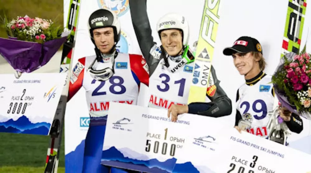 Словенец Юрий Тепеш выиграл этап Кубка мира по прыжкам на лыжах с трамплина в Алматы, передает корреспондент Tengrinews.kz. Его соотечественник Юре Синковец стал серебряным призером. Замкнул тройку сильнейших норвежец Андерс Фаннемель. По мнению экспертов, главным фаворитом алматинского этапа Кубка мира считался именитый норвежец Том Хильде. Однако в первом прыжке он показал лишь 11-й результат, что стало главной сенсацией первенства. Несмотря на то, что во второй попытке он прыгнул на 126 метров, в тройку призеров Хильде не попал. Всего соревнования в южной столице собрали 39 спортсменов. Из семи казахстанцев во второй, решающий раунд турнира пробились лишь двое - победитель Азиатских игр Евгений Левкин и Алексей Королев. В итоге лучший результат показал Королев - 25-й. Во второй попытке он прыгнул на 115,5 метра. При приземлении казахстанец потерял равновесие, упал, но серьезных травм избежал. Левкин завершил соревнования на 26-й строчке. Стоит отметить, что призовой фонд соревнований в Алматы составил 12 тысяч швейцарских франков (14,7 тысячи долларов). Победитель заработал пять тысяч франков, спортсмены, занявшие второе и третье места, получили на две и три тысячи франков меньше соответственно. Стоит отметить, что Казахстан впервые принимал соревнования подобного уровня. Таким достижением не может похвастаться больше ни одна из стран СНГ.