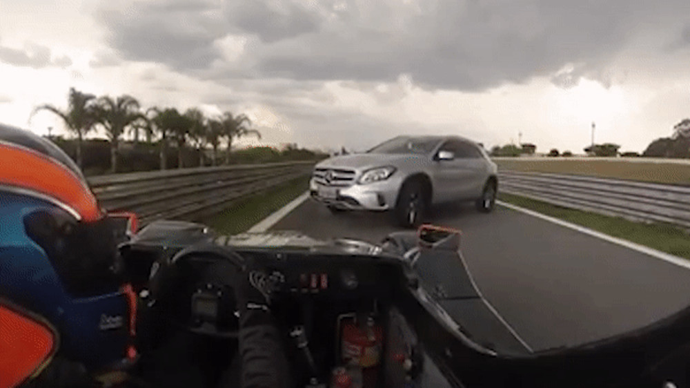Гонщик жестами начал показывать водителю Mercedes, чтобы тот убрал машину с пути, однако водитель растерялся и начал поворачивать то в одну, то в другую сторону, тем самым задерживая гонку. Более того, со стороны пит-лейна выехал еще один гонщик и тоже натолкнулся на абсолютно неожиданное препятствие.