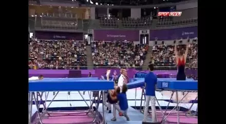 На соревнованиях по прыжкам на батуте в рамках первых Европейских игр в Баку волонтер спас польского гимнаста, прыгнувшего мимо батута, сообщает Trend.