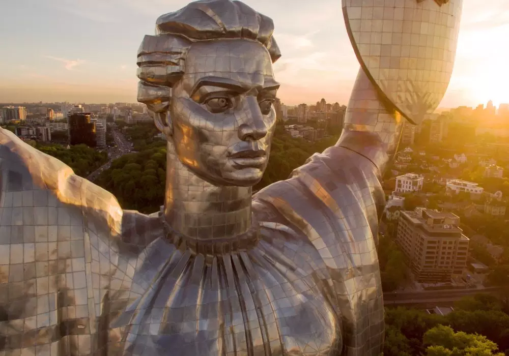 Родина-мать, Киев, Украина. Высота стальной статуи составляет 102 метра. Она была установлена в 1981 году. Статуя расположена на территории Музея истории Украины во Второй мировой войне, в центре Киева на правом берегу реки Днепр. Российский аналог такой статуи называется "Родина-мать зовет", она находится в Волгограде. Ее высота составляет 85 метров. Статуя чуть ниже украинской, но зато она была возведена на 20 лет раньше, в 1959-м и некоторое время считалась самой высокой в мире. Грандиозный монумент расположен на вершине Мамаева кургана.