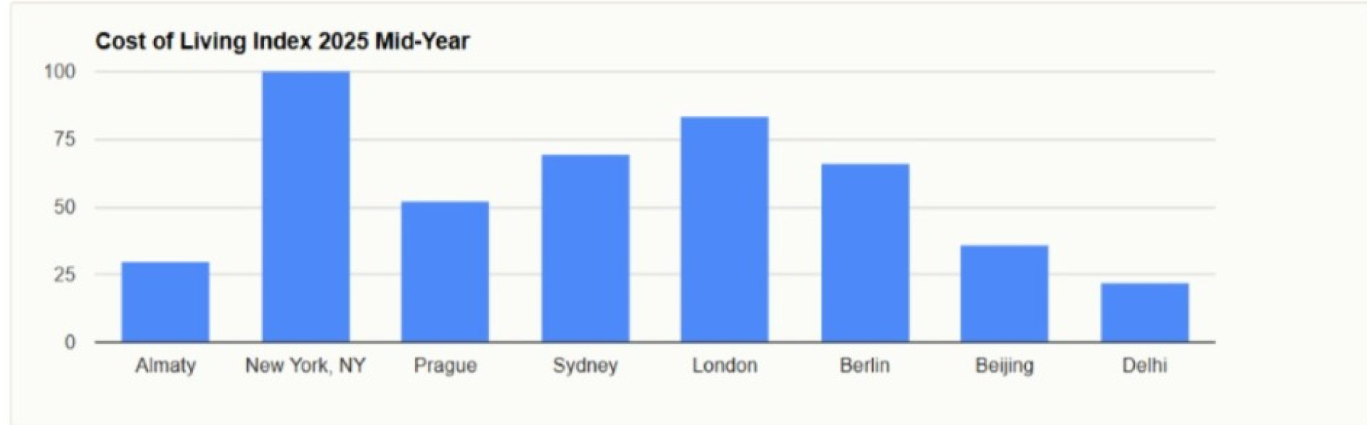 Индекс стоимости жизни в Алматы составил 29,4 пункта. Это вывело его на 346-е место в общемировом списке. Астана с показателем 26,5 заняла 366-ю строчку. Для сравнения: Бишкек занял 364-е место с индексом 26,8, а Ташкент — 370-е с 26,2. Города Таджикистана и Туркменистана в рейтинге не представлены.