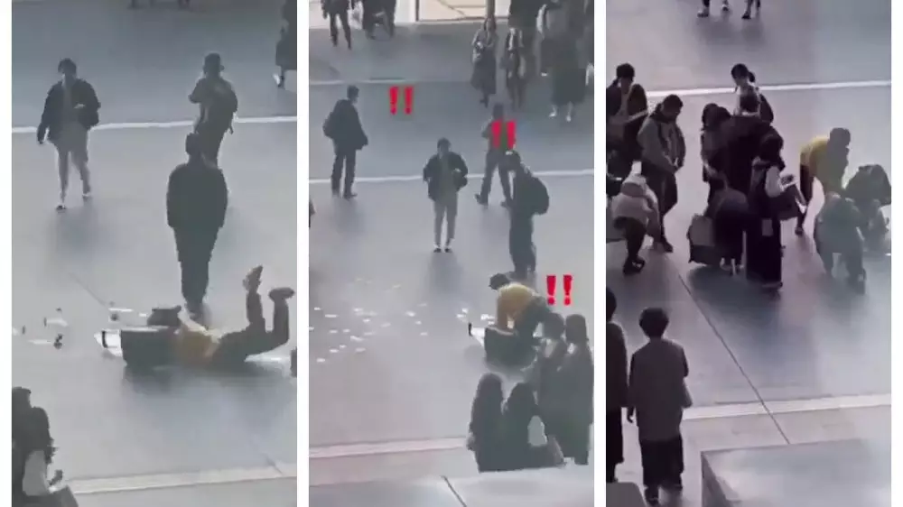 На видеокадрах, снятых камерой видеонаблюдения, предположительно, на железнодорожной станции в Осаке, молодой человек в желтом свитере падает на пол и рассыпает личные вещи.