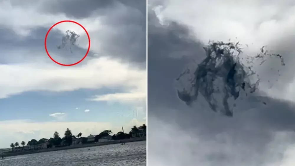 На видео показано нечто, похожее на темную массу, парящую в воздухе над водой отдельно от других облаков рядом. Житель Сиднея, снявший это зрелище, предположил, что это нечто похоже на жидкий металл.