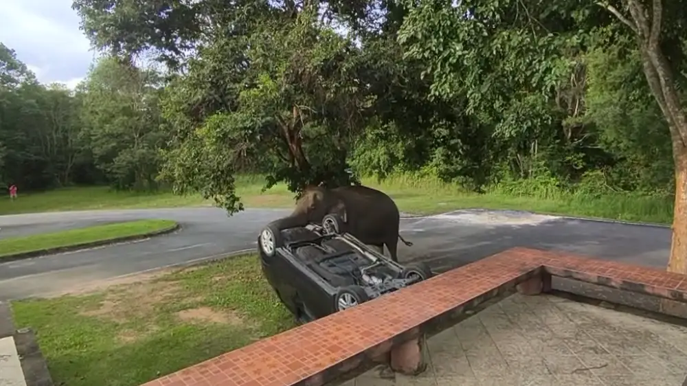 Голодный слон перевернул машину туристов в национальном парке Као Яй Таиланда, передает Tengri Travel со ссылкой на Pattaya Mail.