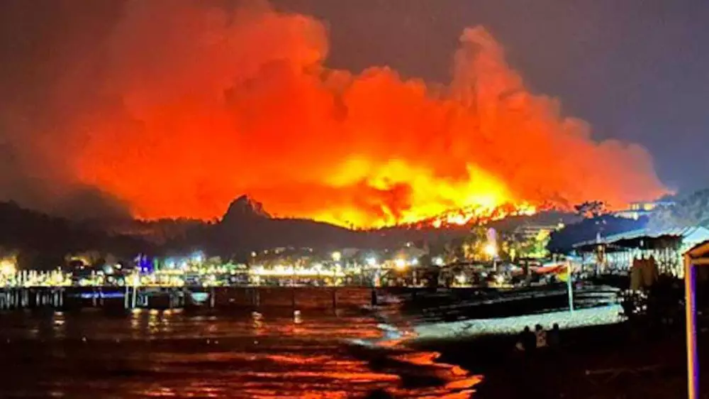 Крупный лесной пожар бушует в районе города Кемера - популярного турецкого морского курорта. Пламя почти дошло до отелей в поселке Гёйнюк. Об этом в телеграм-каналах в ночь на вторник сообщают российские туристы, передает Tengri Travel.