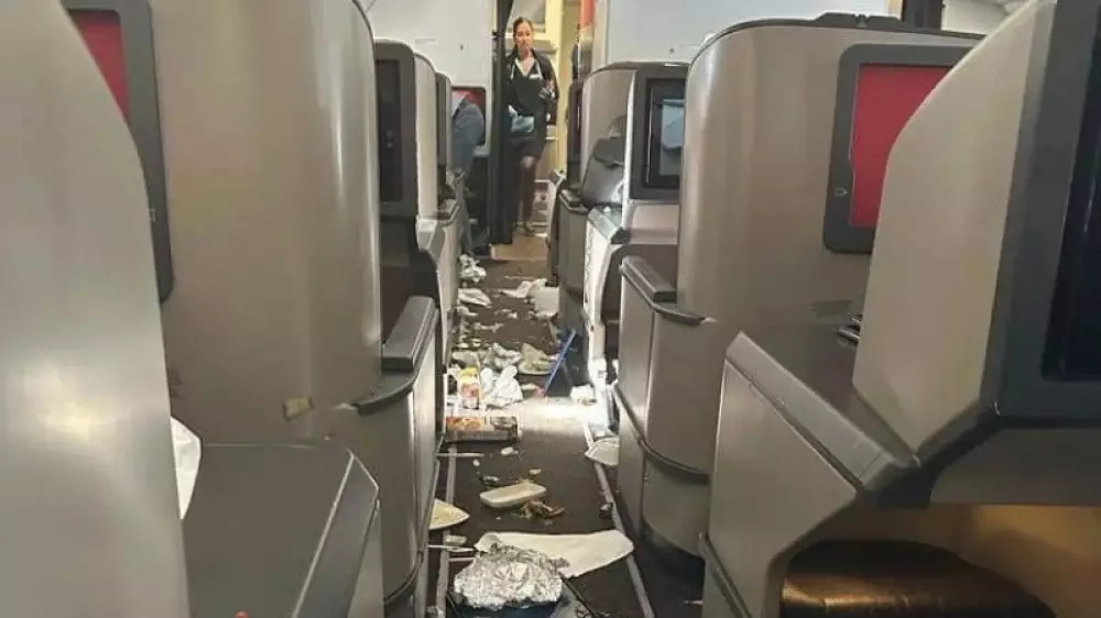 "Пассажирка поделилась с подписчиками кадрами, как в результате тряски ее вино разлилось по потолку и полу салона, а проходы оказались завалены едой, подносами и пластмассовыми приборами.