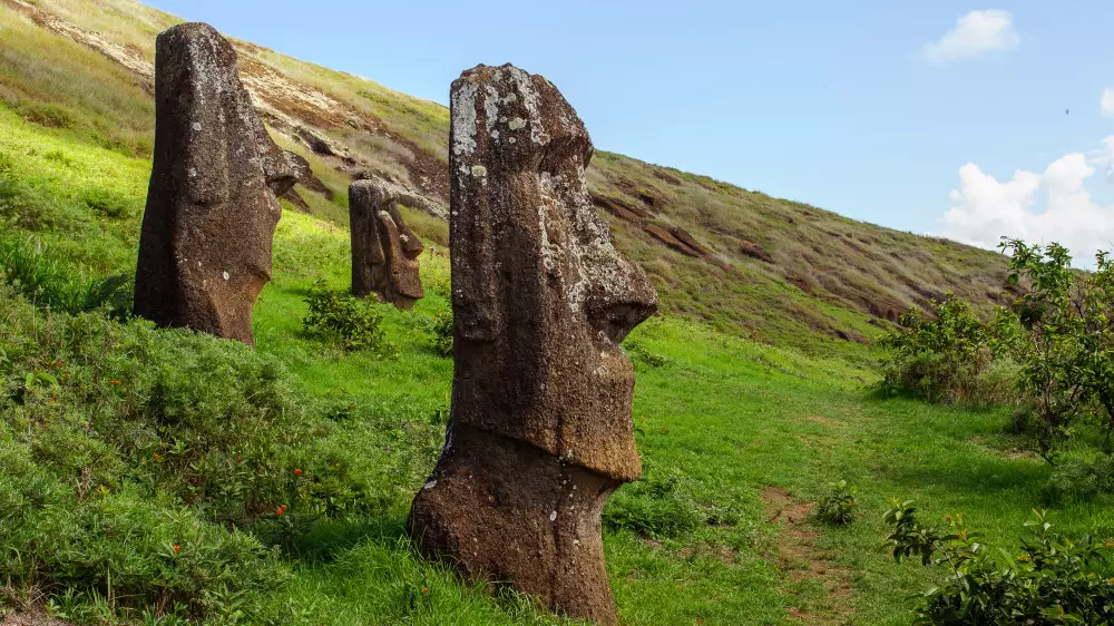 Моаи – это характерные монолитные резные каменные фигуры с удлиненными лицами и без ног, которые в основном были вырезаны из туфа, разновидности вулканического пепла, на вулкане Рано Рараку. Считается, что эти памятники представляют полинезийских предков обитателей острова Пасхи и когда-то были связаны с ритуальной деятельностью, образуя центр для местных общин.