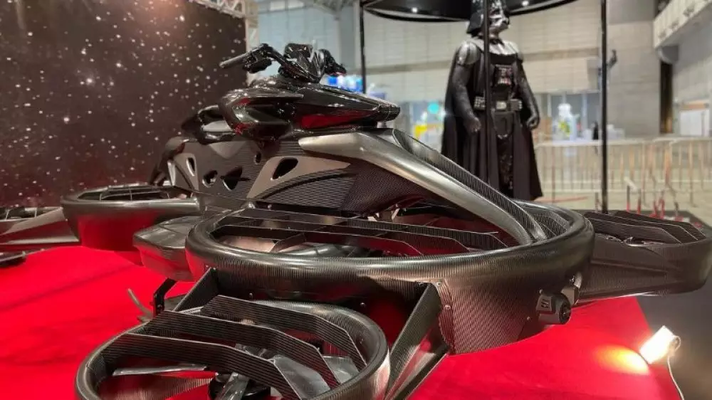 Летающий ховербайк изготовлен из высокопрочного углеродного волокна, используемого в авиации и космической отрасли. Он весит 300 килограммов и оснащен четырехтактным бензиновым гоночным двигателем Kawasaki с турбонаддувом мощностью 230 лошадиных сил.