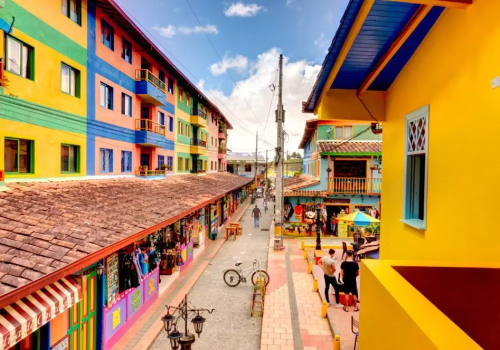 Самый яркий в мире город - Гуатапе, Колумбия. В Колумбии, недалеко от второго по значимости города страны Медельина, расположился небольшой разноцветный городок Гуатапе. В нем все дома и здания, в том числе магазины, кафе, школы, даже больницы и муниципалитет, раскрашены и разрисованы в яркие цвета. Кроме того, нижние части фасадов многих домов дополнены оригинальными рисунками со сценами из жизни города. Разрисовывать свои дома таким образом местные жители начали более 150 лет тому назад, поэтому сегодня можно легко изучить историю города по этим рисункам.
