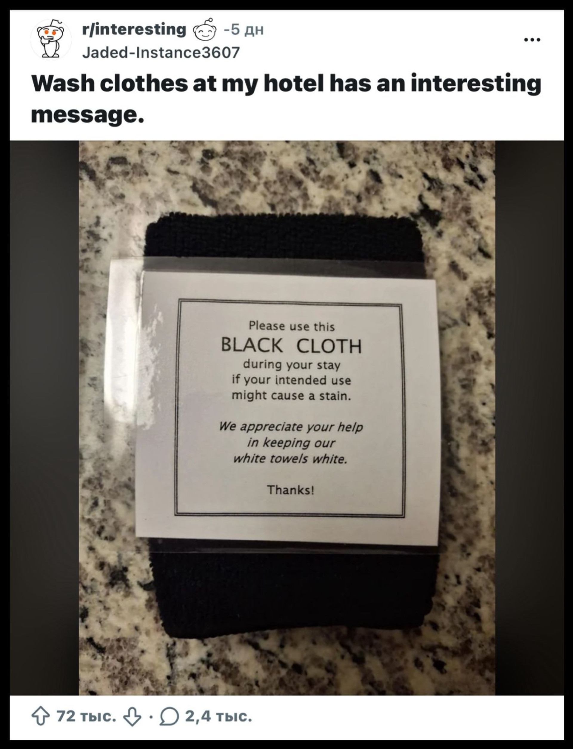 "Пожалуйста, используйте эту черную ткань во время вашего пребывания, если предполагаемое использование может оставить пятна. Мы ценим вашу помощь в сохранении наших белых полотенец белыми. Спасибо!" — говорилось в сообщении на ткани.