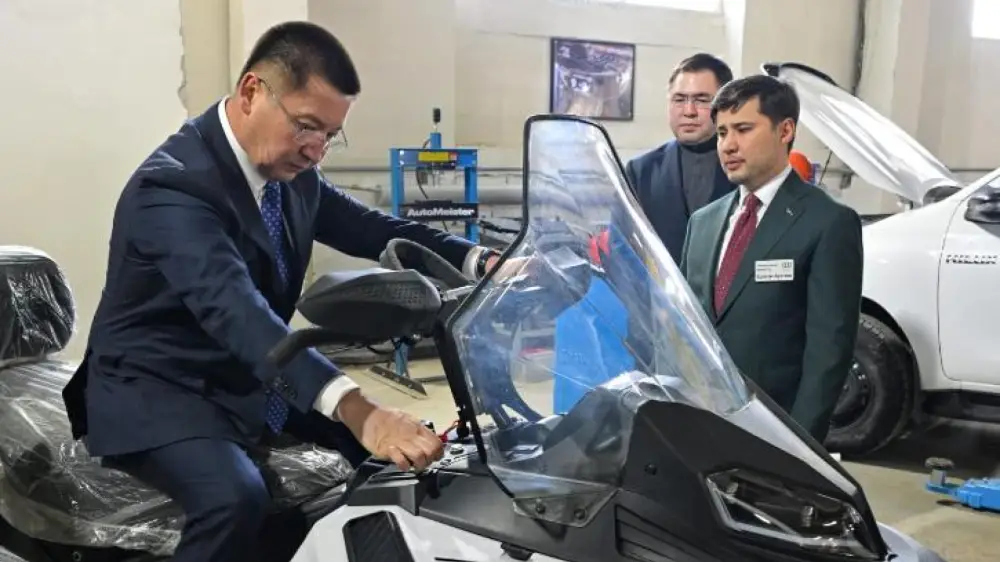 На этом проверка не закончилась. После этого господин Байханов попробовал себя в роли водителя квадроцикла. Примечательно, что защитный целлофан с сиденья так и не сняли — даже для акима.