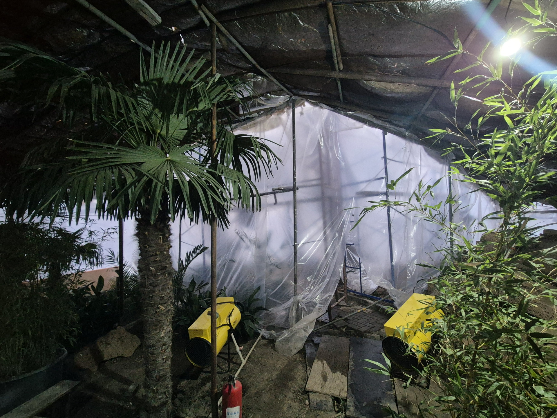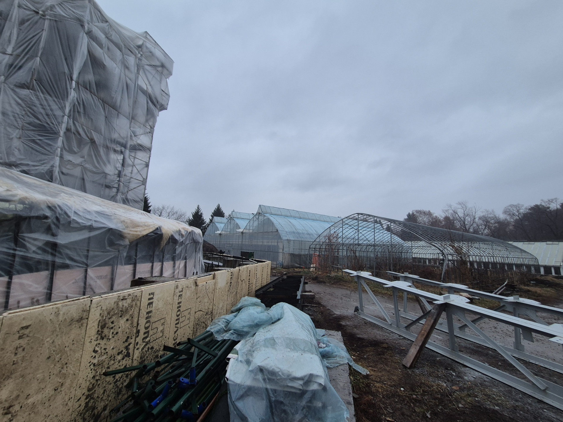 За прошедшие три зимы и сотрудники, и сами растения смогли немного адаптироваться. Те, что можно было пересадить в горшки и перенести в теплицы, перенесли. Другие — те, что давно высажены в грунт — утепляют, как могут. Металлические каркасы перед зимой заблаговременно обтягивают плёнкой в несколько слоев, крышу покрывают стекловатой.