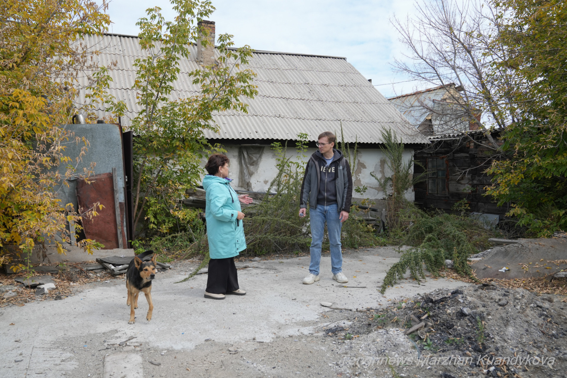Журналист Иван Сухоруков разговаривает с Ириной, жительницей Ондириса (Лесозавода). Фото: ©️ Tengrinews.kz / Маржан Куандыкова