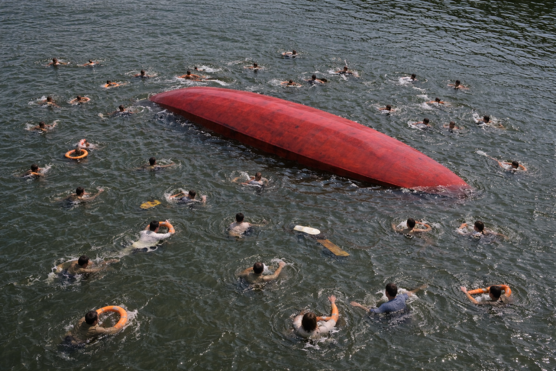 Потом к месту подошёл военный катер. К потерпевшему крушение судну подцепили стальной трос, дёрнули и перевернули его. Спасатели бросились вытаскивать тех, кто ещё подавал признаки жизни. Спустя время катер, уже набравший воды, пошёл ко дну.