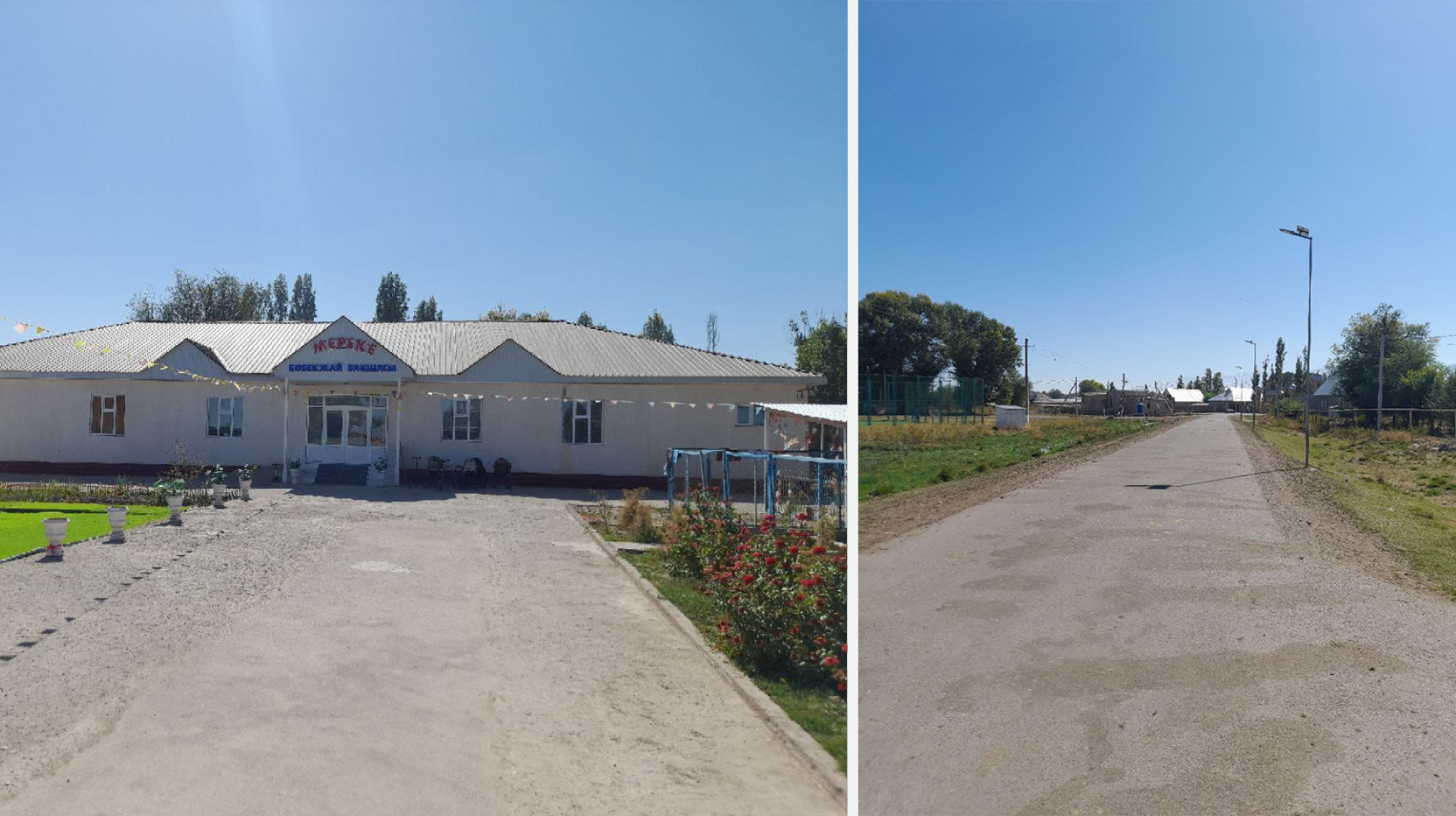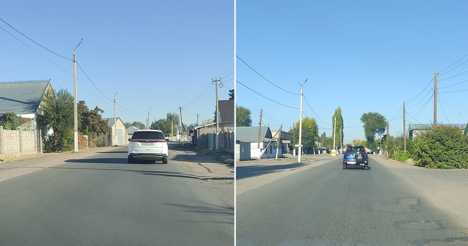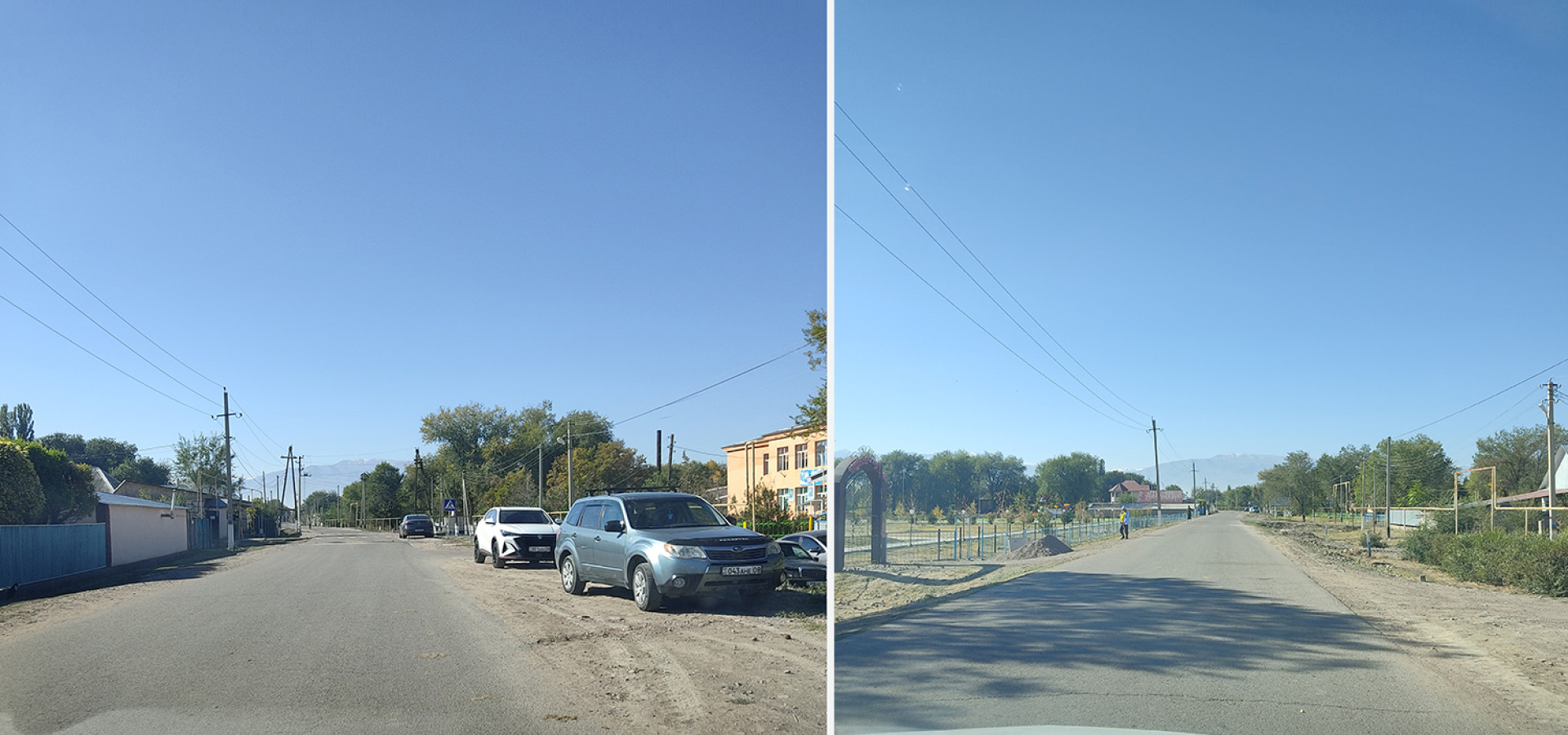 В центре самого Мерке дорогая ровная. На правом снимке видны следы недавнего ремонта: