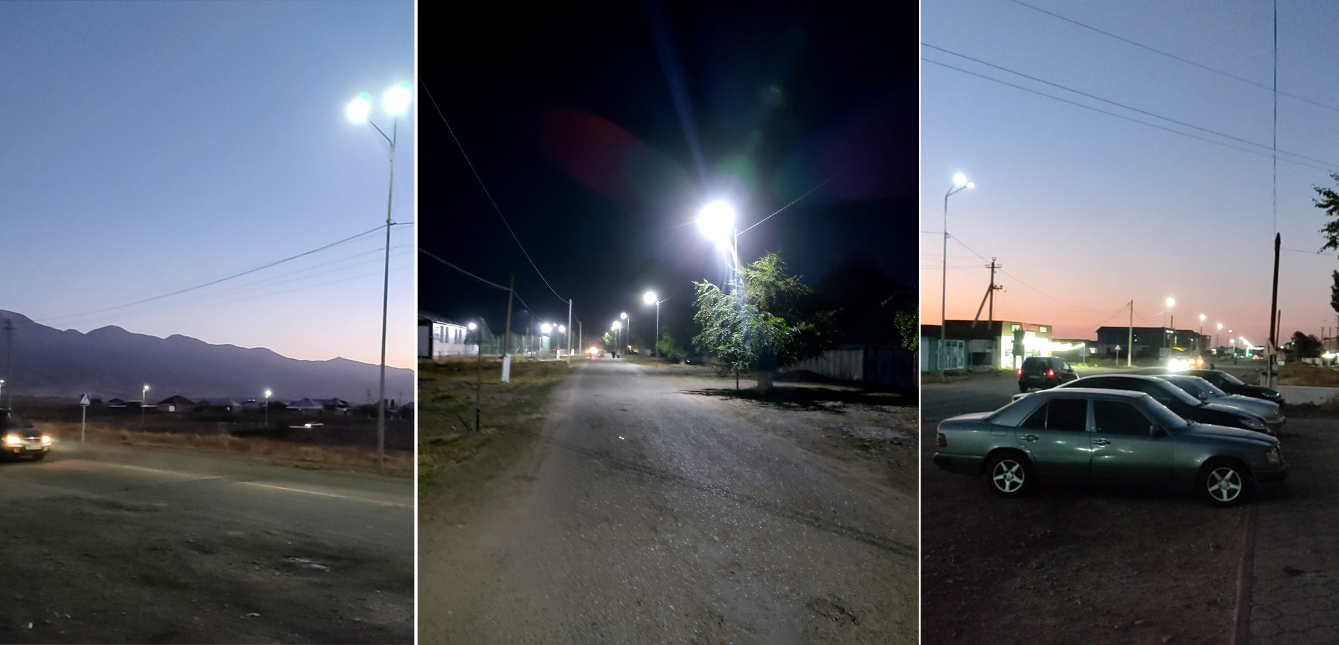 Вечернее освещение: 1, 3 — Мерке, улица Сарымолдаева, 2 — первое отделение, поселок Интернациональный. Фото: ©️ Tengrinews.kz / Юлия Колмогорова