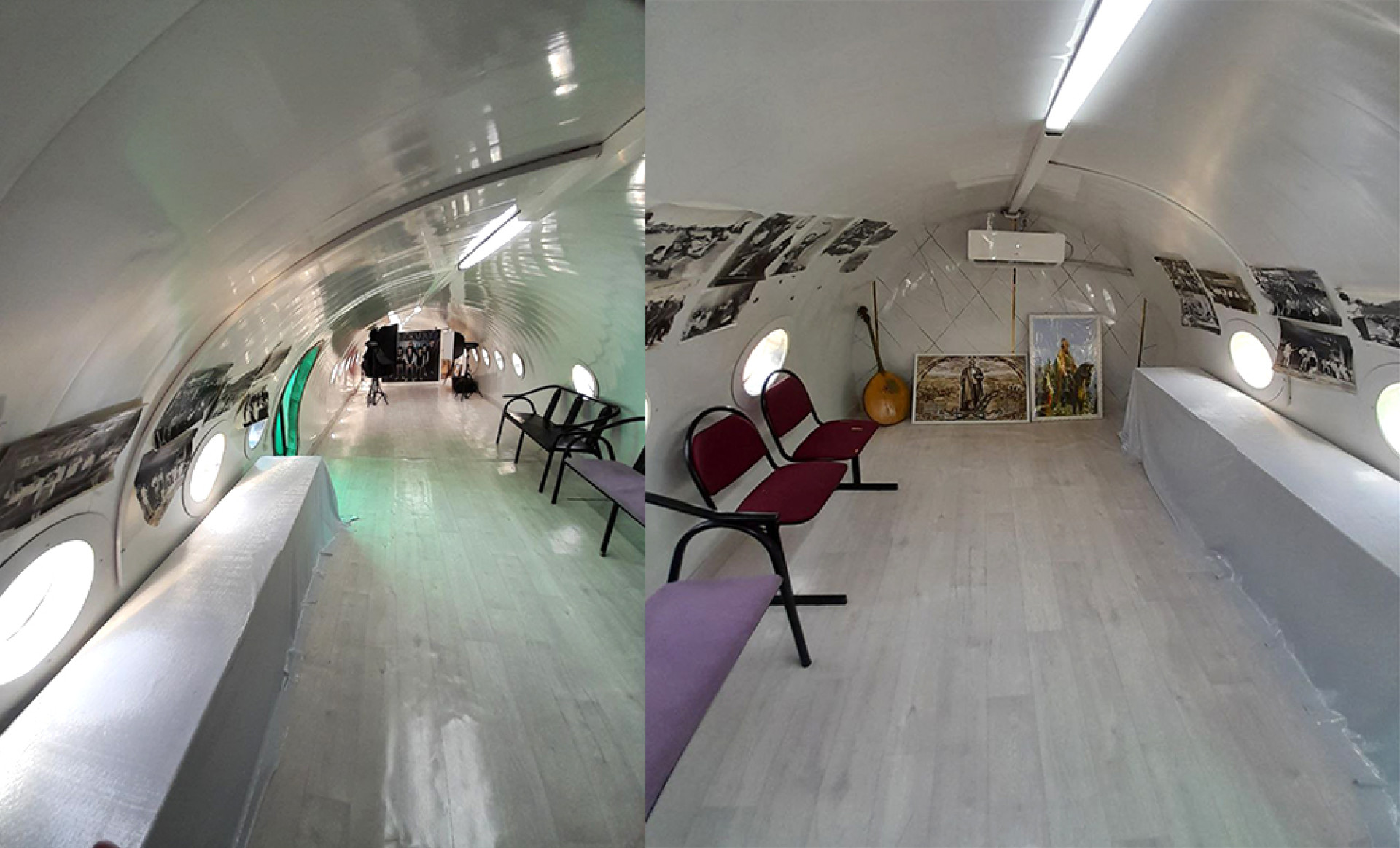 Когда-то давно в салоне самолёта был кинотеатр. А сейчас там проводятся выставки и фотосессии: