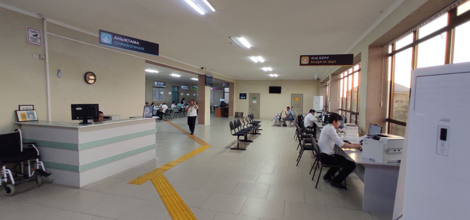 Мы также выяснили, насколько в Меркенском районе доступны социальные услуги. Меркенский ЦОН в точности повторяет многие отделения Алматы. То же оформление, та же электронная очередь: