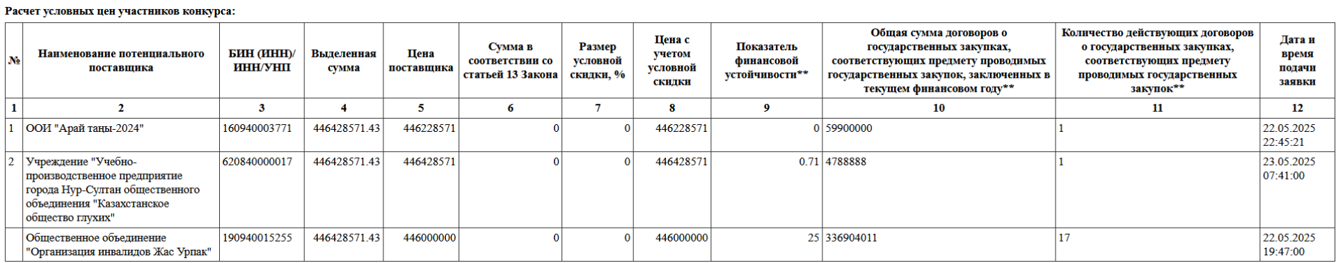 Не до конца ясно, почему организация "Арай таңы - 2024" стала победителем, а Казахстанское общество глухих заняло второе место, так как оба поставщика оказались подходящими. Возможно, дело в том, что у победителя конкурса было больше контрактов на подобные виды работ в прошлом.