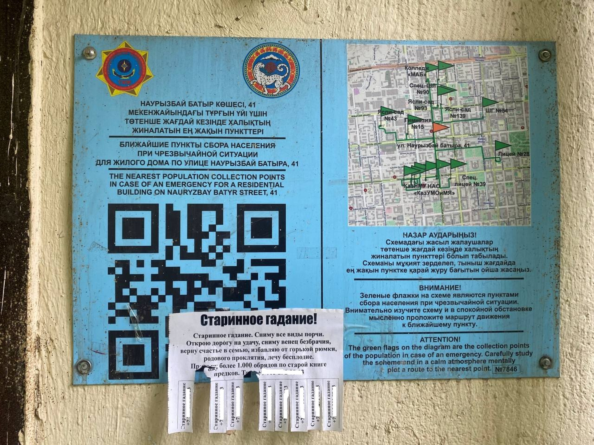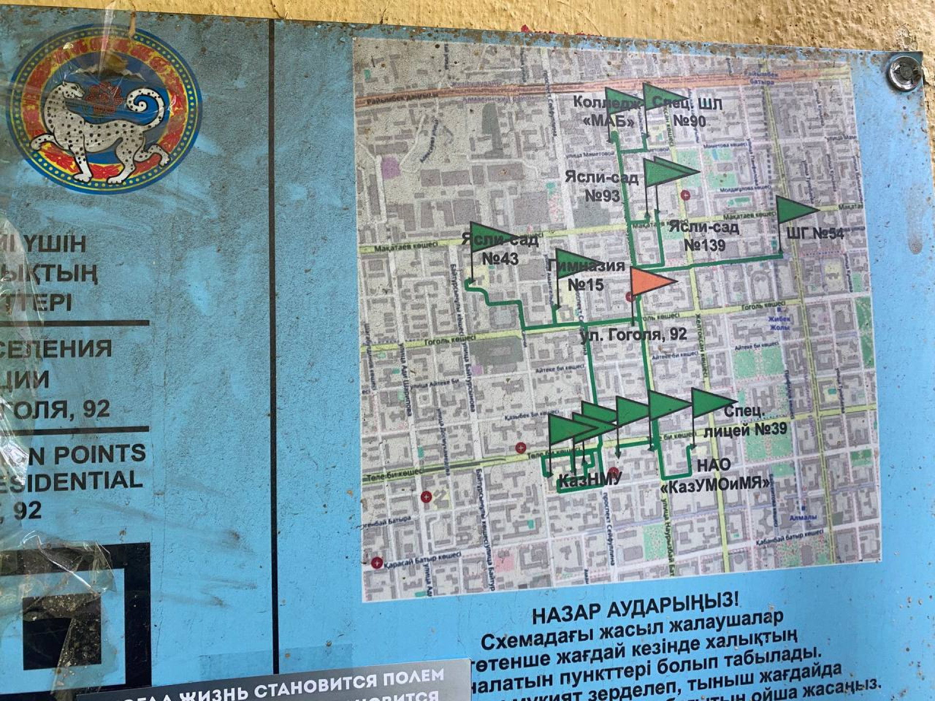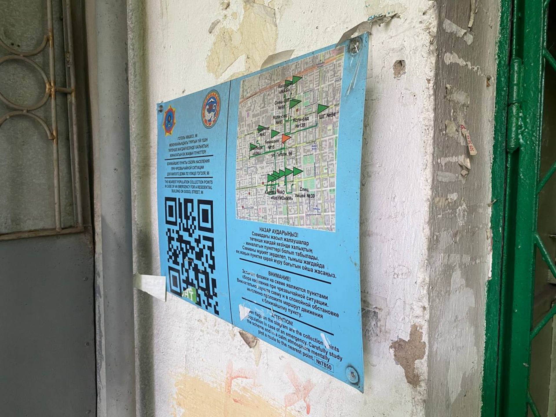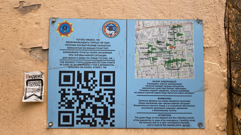 Они установлены почти у каждого подъезда в городе. Их, к слову, производили также за государственный счёт. В 2023 году ДЧС города потратил на это более 201 миллиона тенге. Всего было куплено 23 500 таких табличек. На них указаны маршруты к ближайшим пунктам эвакуации.