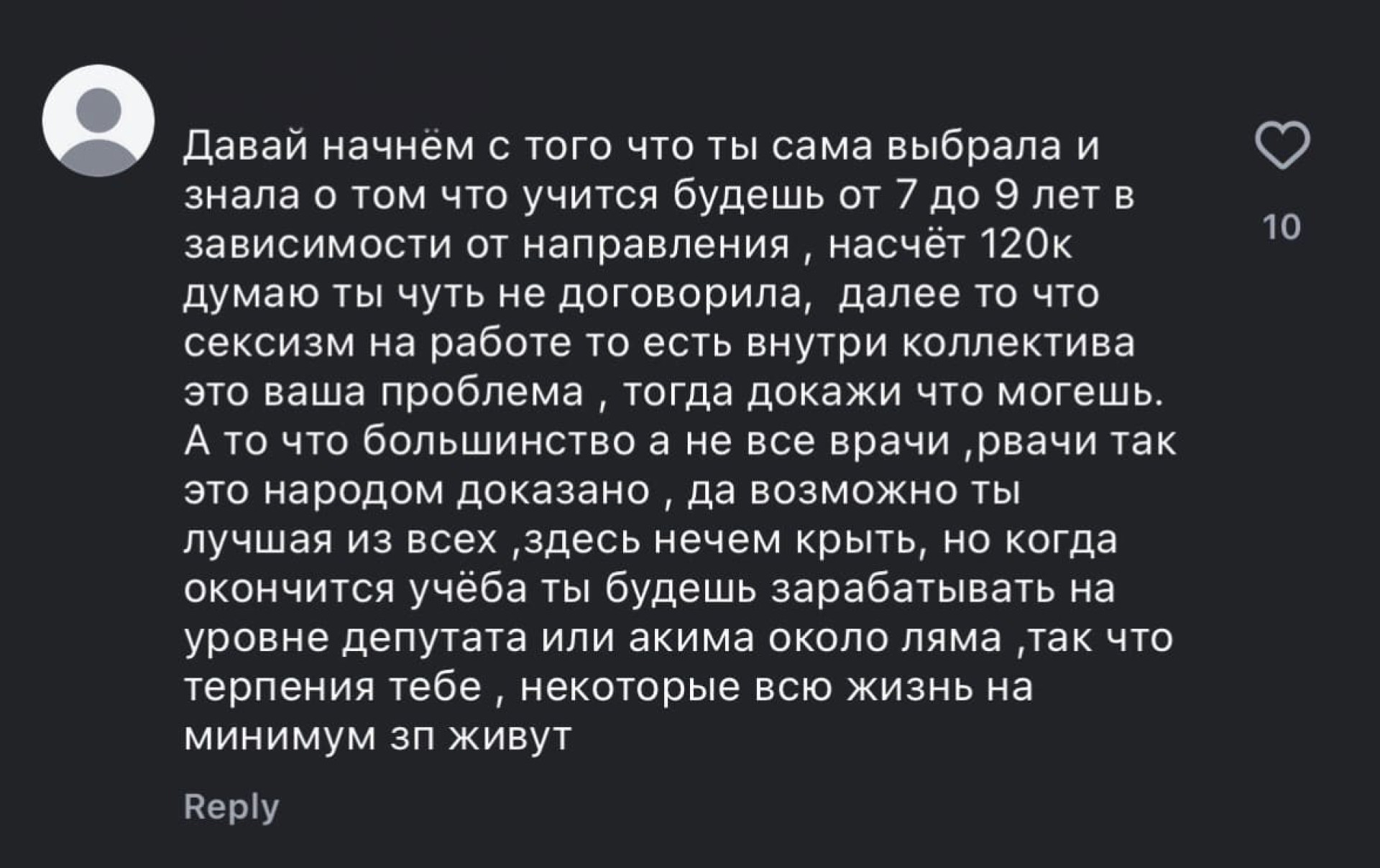 Ладно бы это писали только люди, которые далеки от медицины. Больше всего меня поразили врачи, которые стали оставлять комментарии из серии: "Когда мы были резидентами, работали бесплатно и не жаловались. Ну что за молодежь пошла?!" Посмотрела профили некоторых: чуть старше или мои ровесники. Молодые врачи. Но даже они не поняли, что в интервью я хотела сказать вовсе не про деньги. А про то, в какой… хм… яме находится наша медицина.