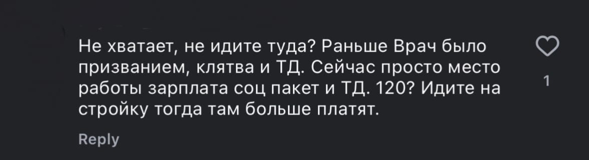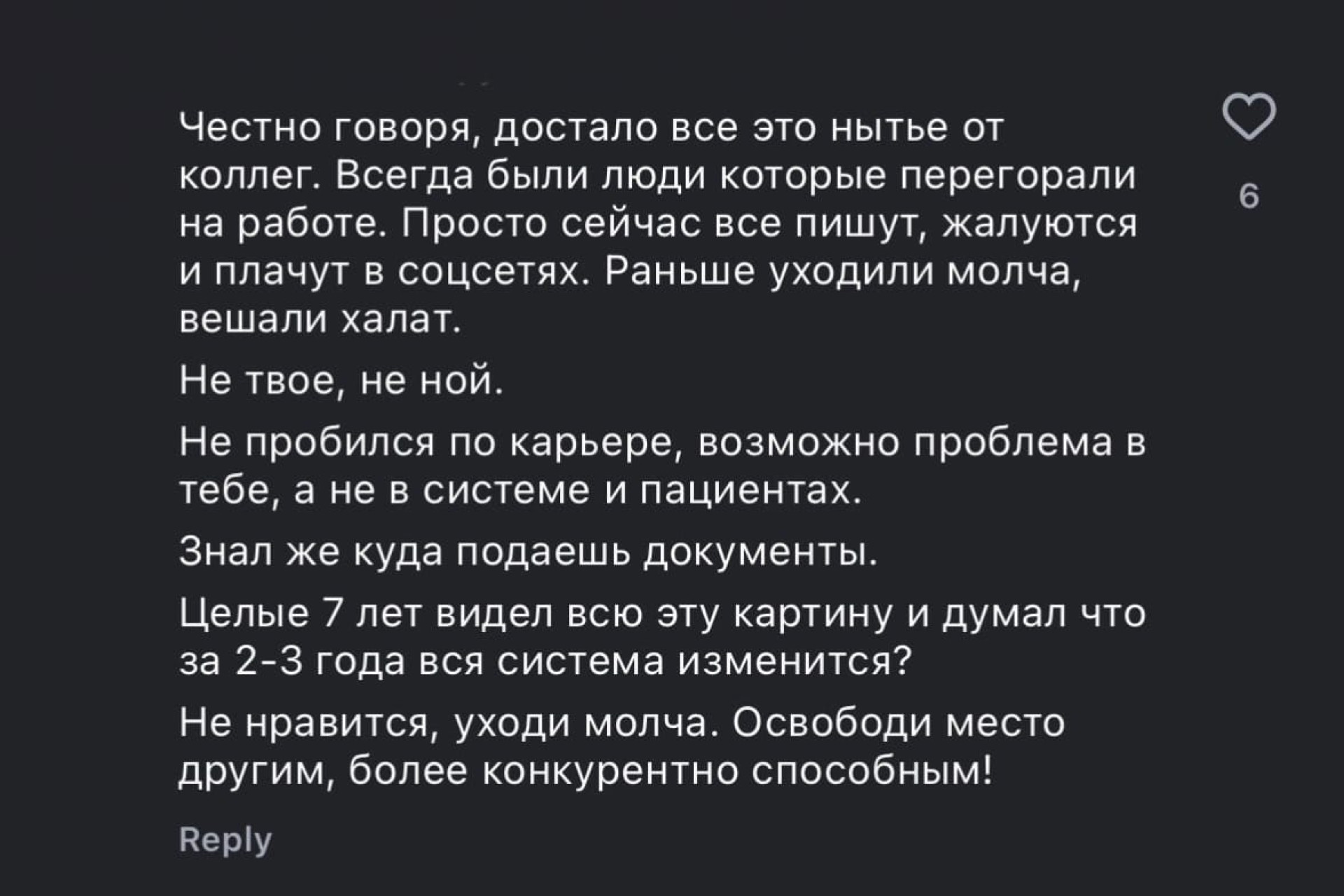 Этого (чего ещё я, наивная, хотела) не скажешь о комментариях под публикацией. Думаете, мы их не читаем? Конечно, читаем. И еще больше убеждаемся, что, видимо, всё-таки нужно уходить из медицины.