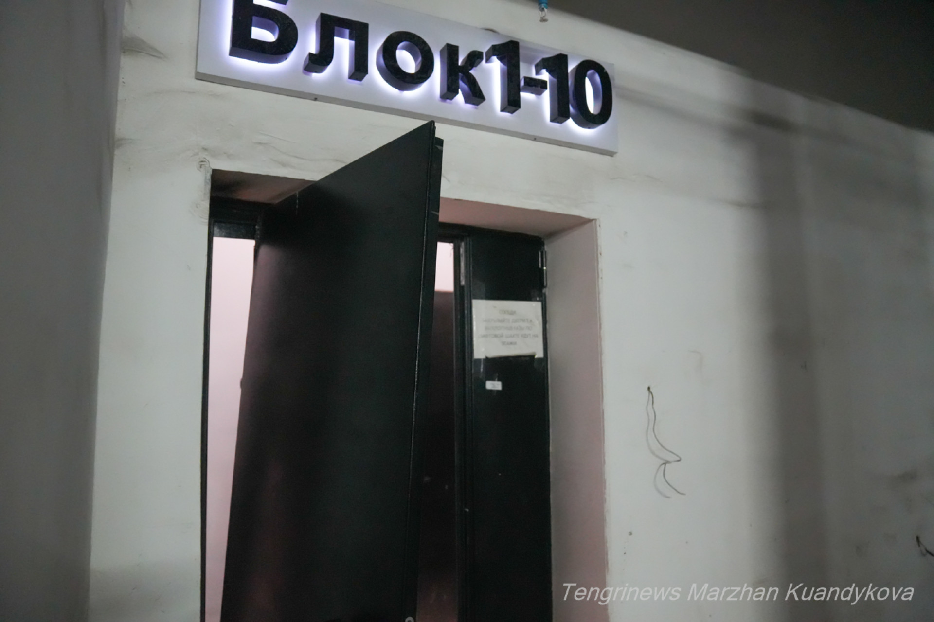 После разговора жильцы предлагают нам увидеть всё своими глазами. Уже на входе — из паркинга в подъезд — нас "встречает" металлическая дверь, почти сорванная с петель: она перекошена, с трудом держится и скрипит при каждом движении, будто предупреждая, что внутри будет не лучше.