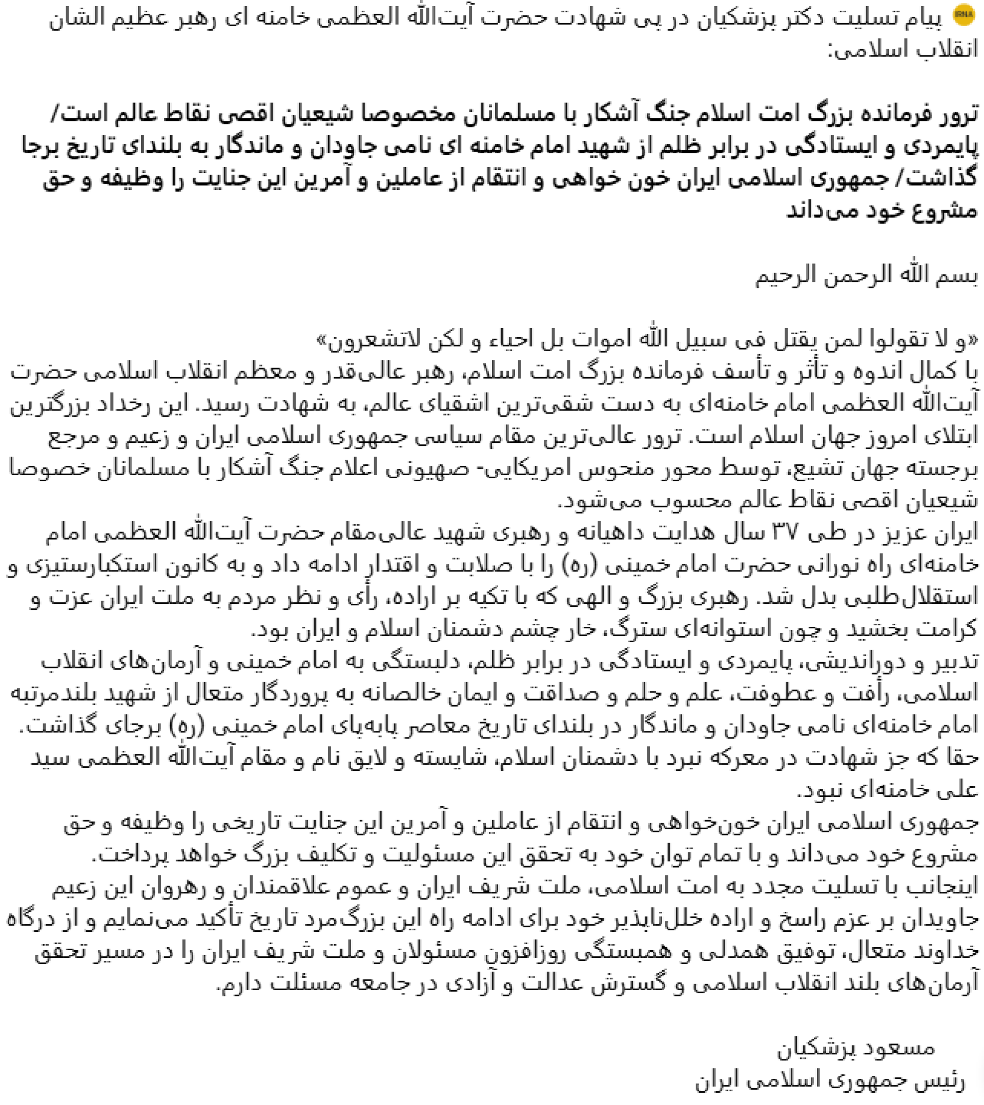 Скриншот сообщения, которое было опубликовано в Telegram-канале иранского информагентства IRNA под названием "Соболезнования доктора Пезешкиана в связи с мученической смертью Его Святейшества Великого аятоллы Хаменеи, великого лидера Исламской революции"