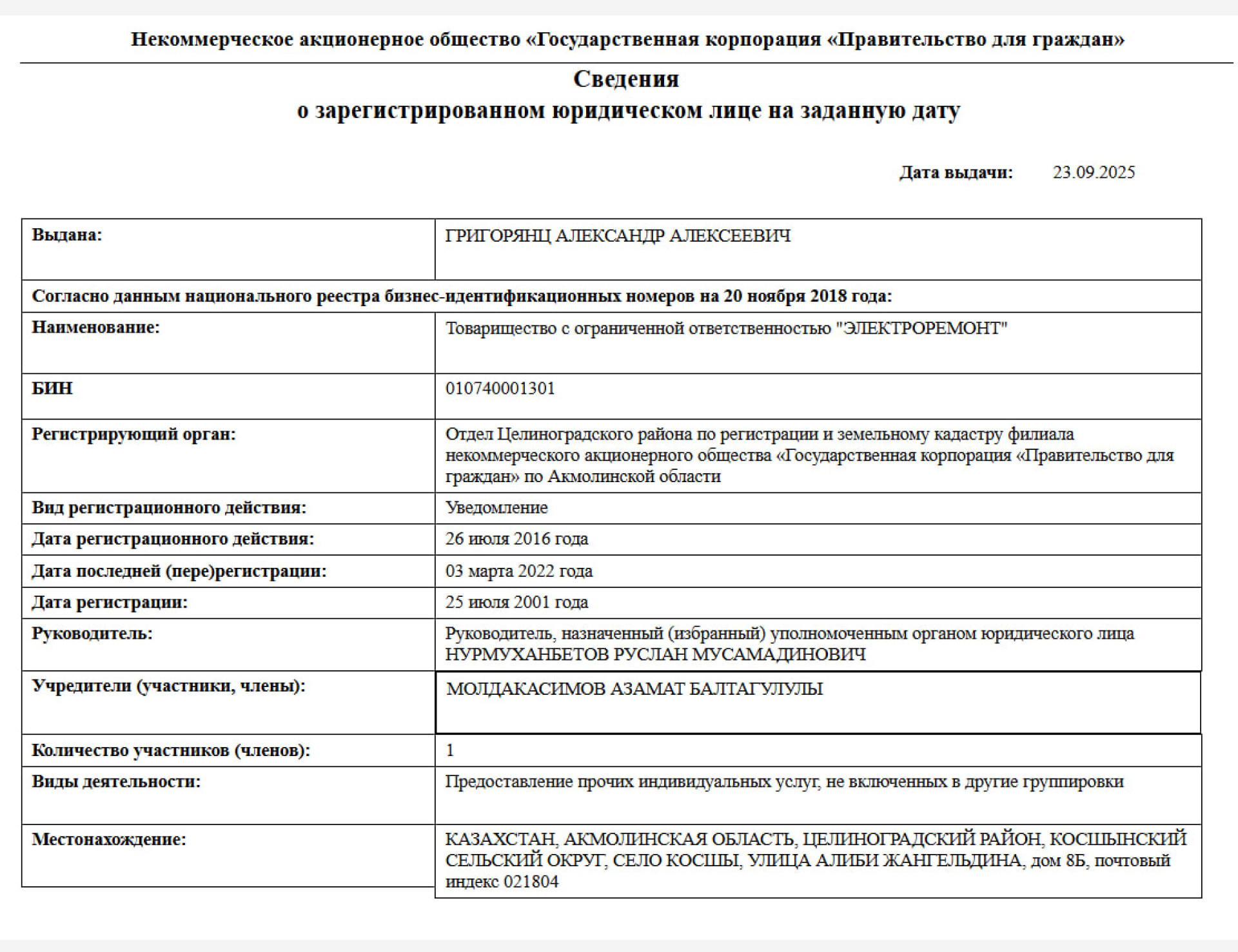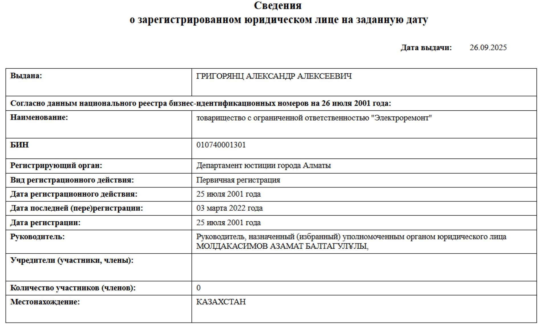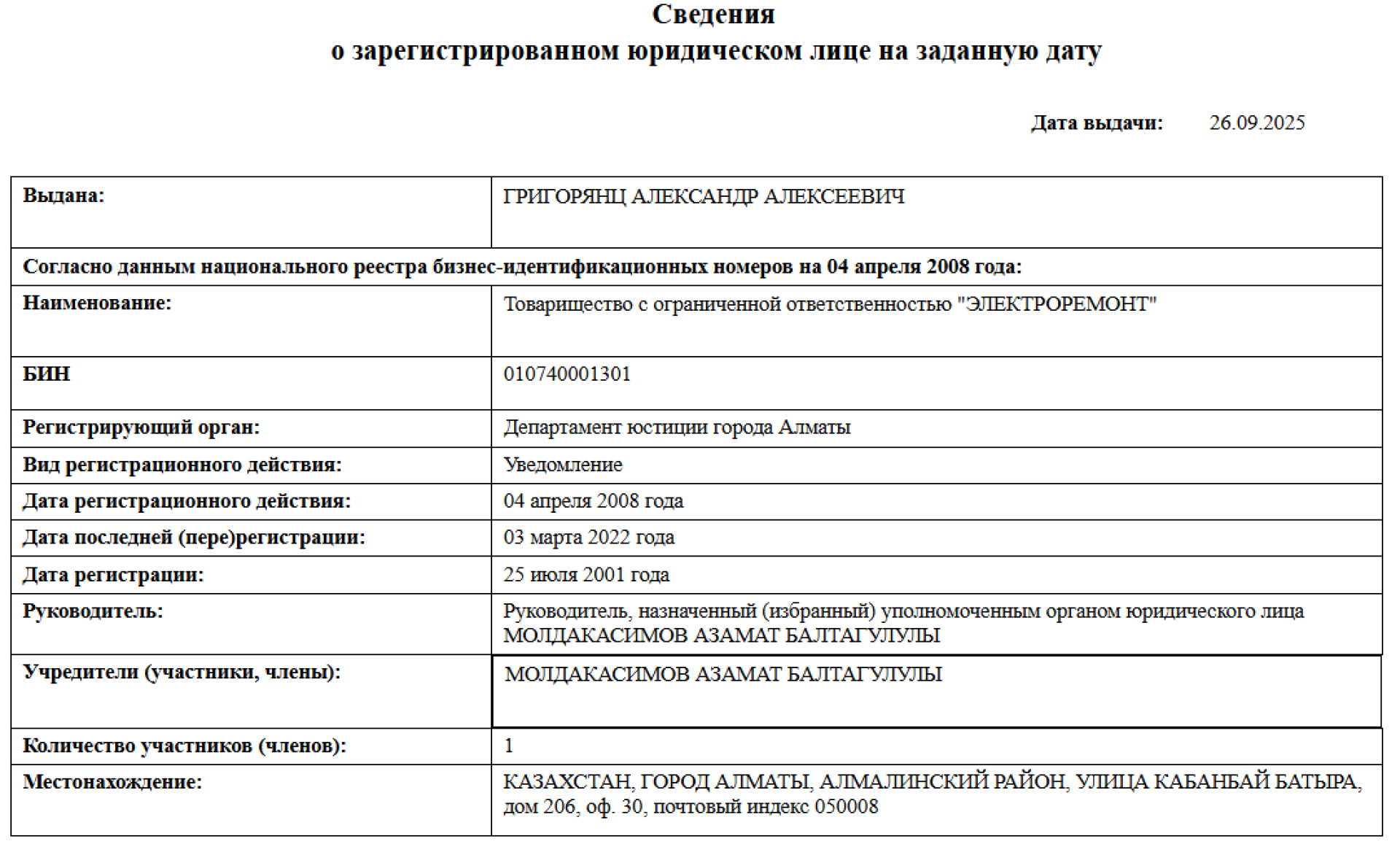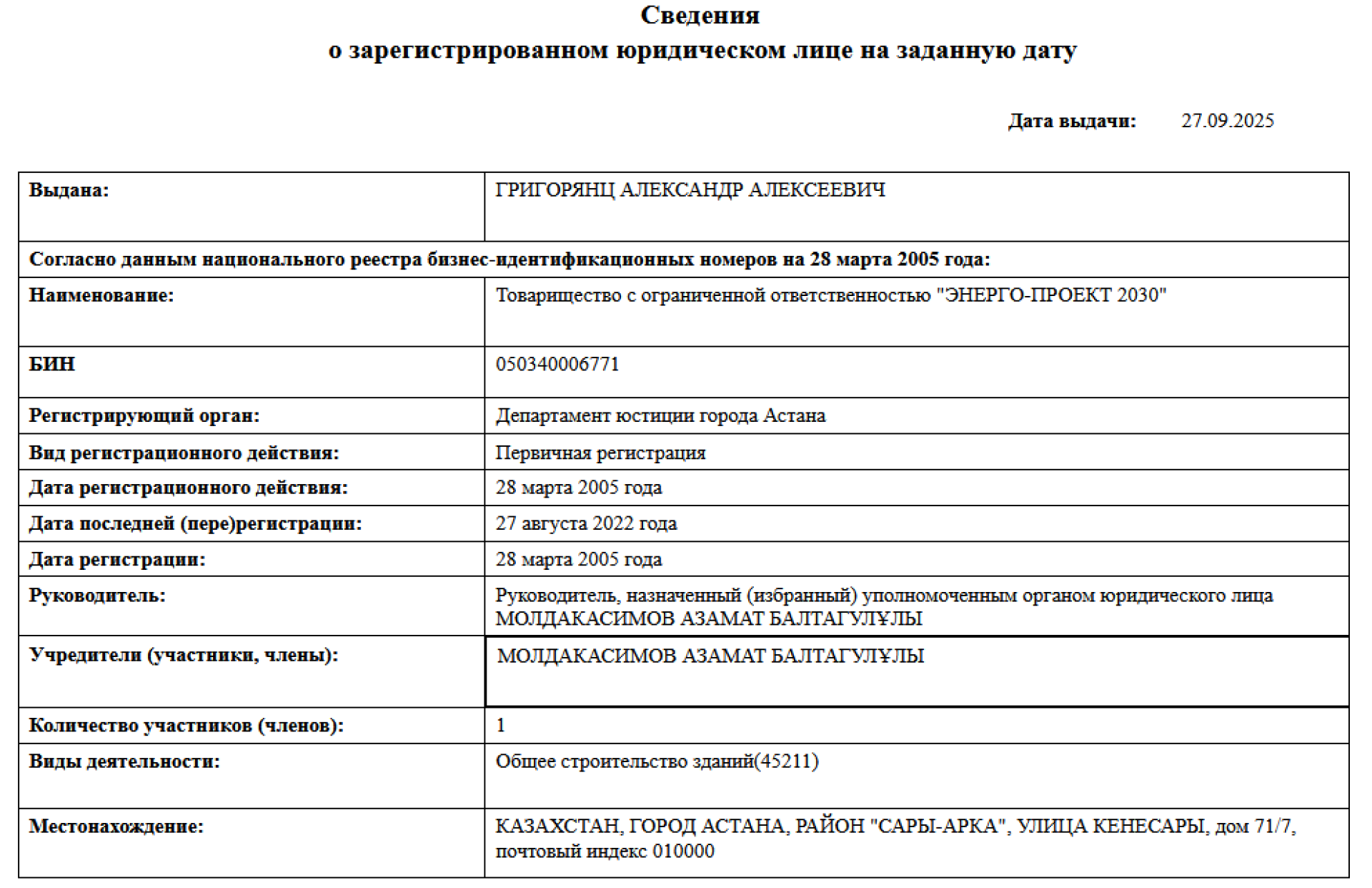 На момент её создания в справке не указано ни одного учредителя, зато в графе "руководитель" указан Молдакасимов Азамат Балтагулулы.