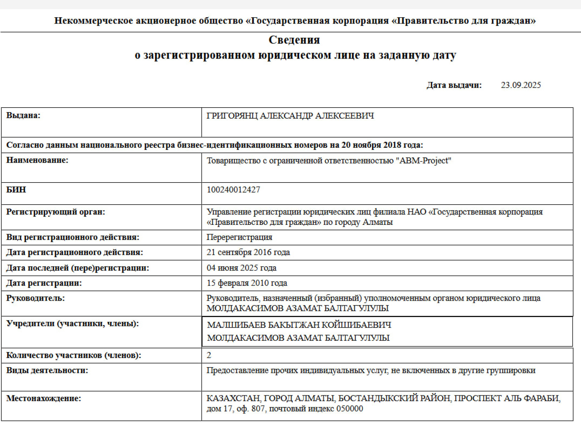 21 сентября 2016 года состав учредителей расширяется. Долю в компании вместе с бизнесменом разделяет некто Бакытжан Малшибаев, однако Молдакасимов дополнительно сохраняет за собой и статус руководителя.