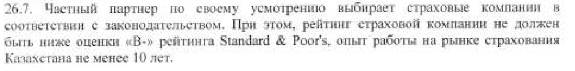 Также отметим, что в договоре есть пункт о том, что частный партнёр по своему усмотрению выбирает страховые компании в соответствии с законодательством. При этом рейтинг страховой компании не должен быть ниже оценки "В-" рейтинга Standard & Poor's, опыт работы на рынке страхования Казахстана не менее 10 лет. Формально это требование связано со снижением рисков, но на практике также ограничивает конкуренцию среди потенциальных страховщиков.