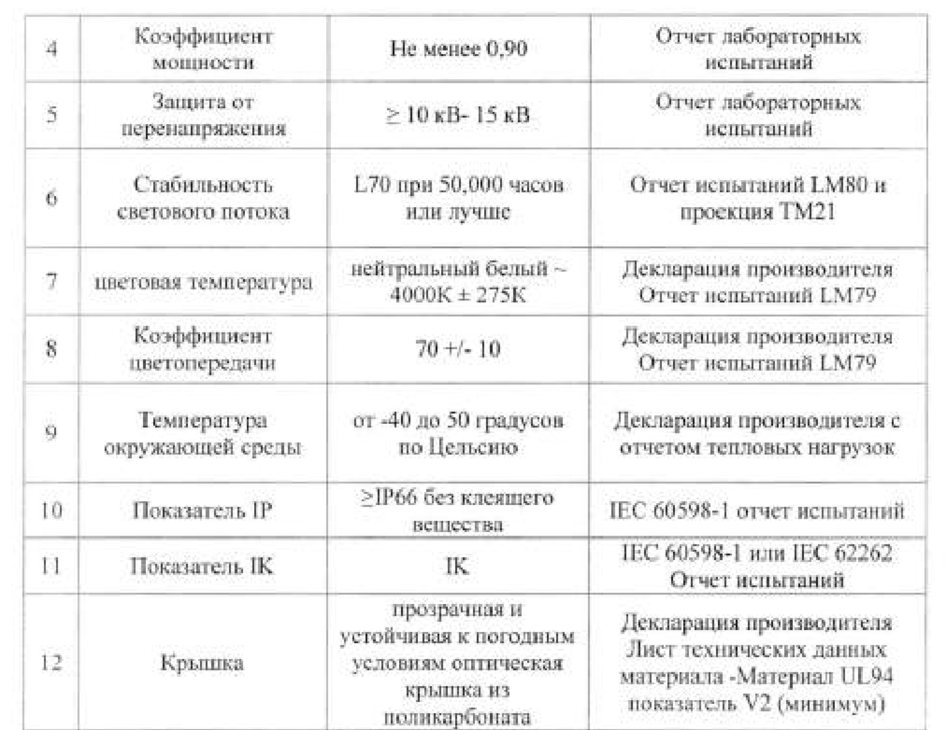 Соответствовать определённому показателю цветопередачи, цветовой температуры и сроку службы.