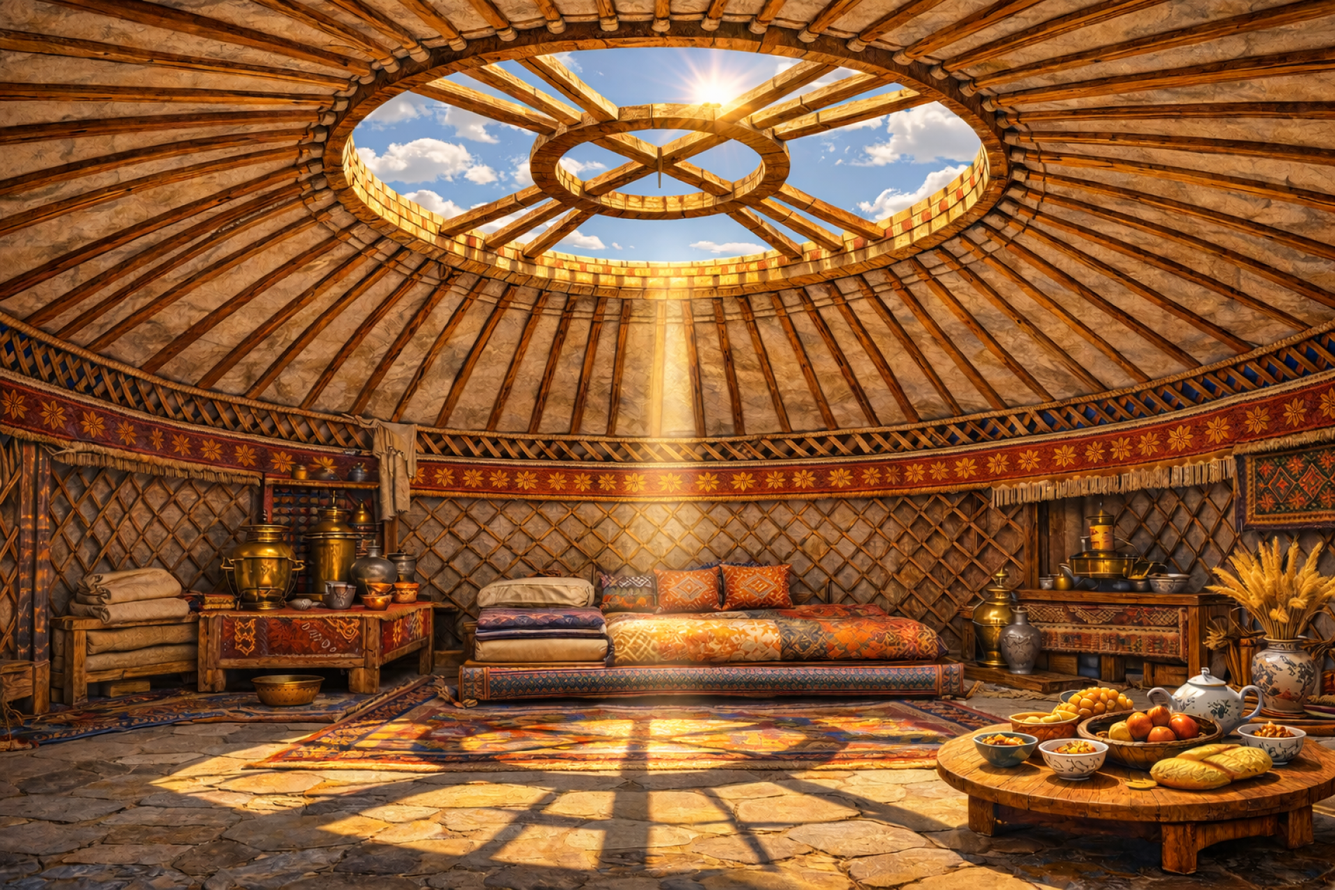 Когда солнечный луч, проходящий через шанырак, останавливался на середине кровати, казахи знали, что наступил обеденный час. Изображение сгенерировано при помощи ИИ