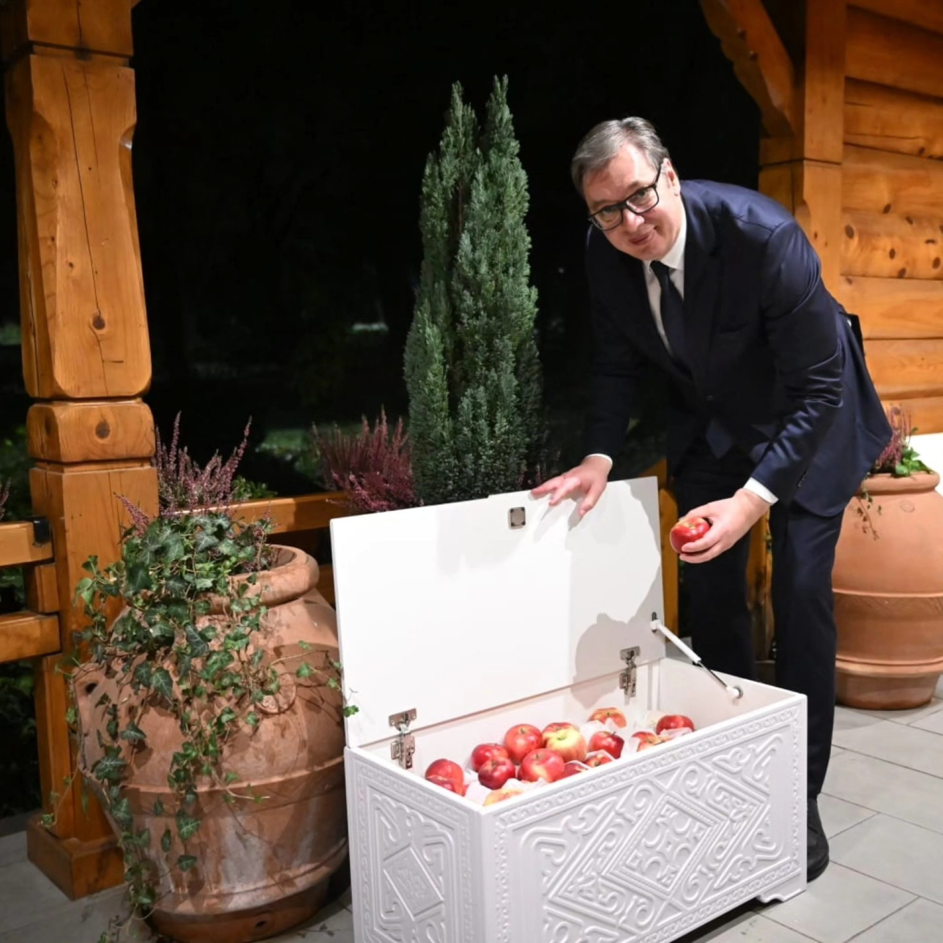 Александр Вучич и ящик алматинского апорта. Facebook/Aleksandar Vučić