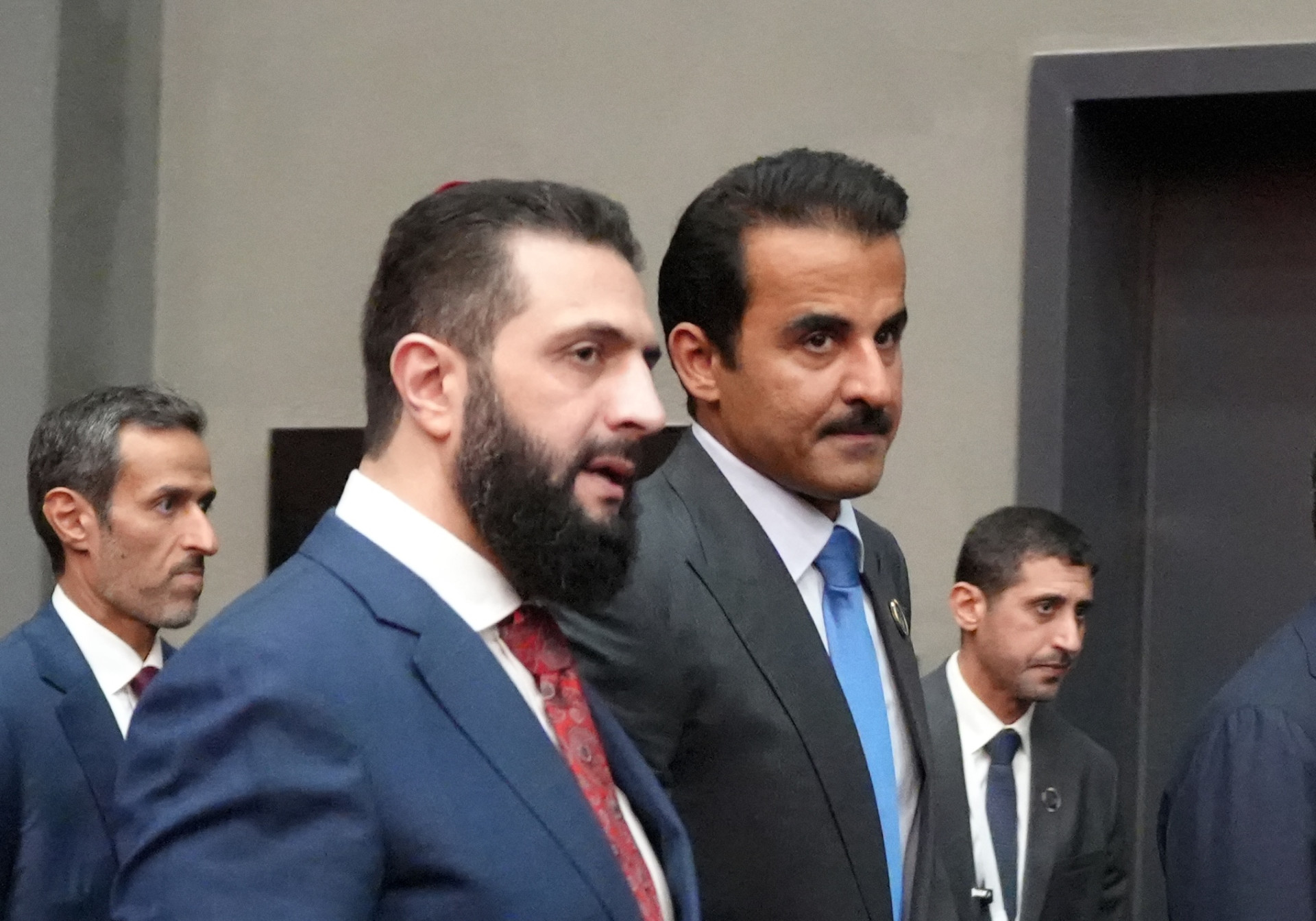 Президент Сирии Ахмед аш-Шараа и эмир Катара Тамим бен Хамад Аль Тани направляются в зал.