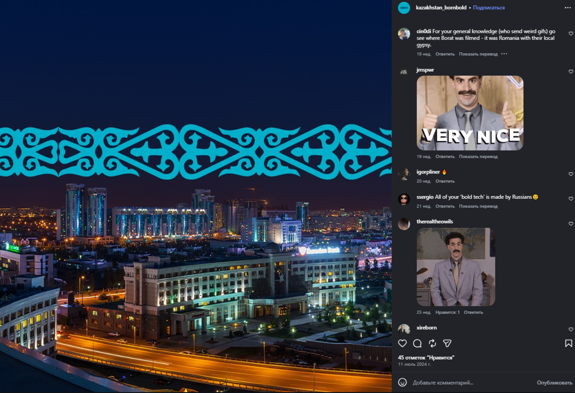 Комментарии под ними немногочисленны ― в основном пользователи отправляли туда анимированные изображения набившего оскомину многим казахстанцам персонажа по имени Борат в исполнении актера Саши Барона Коэна. Из чего можно сделать вывод, что аккаунт никем не модерировался.