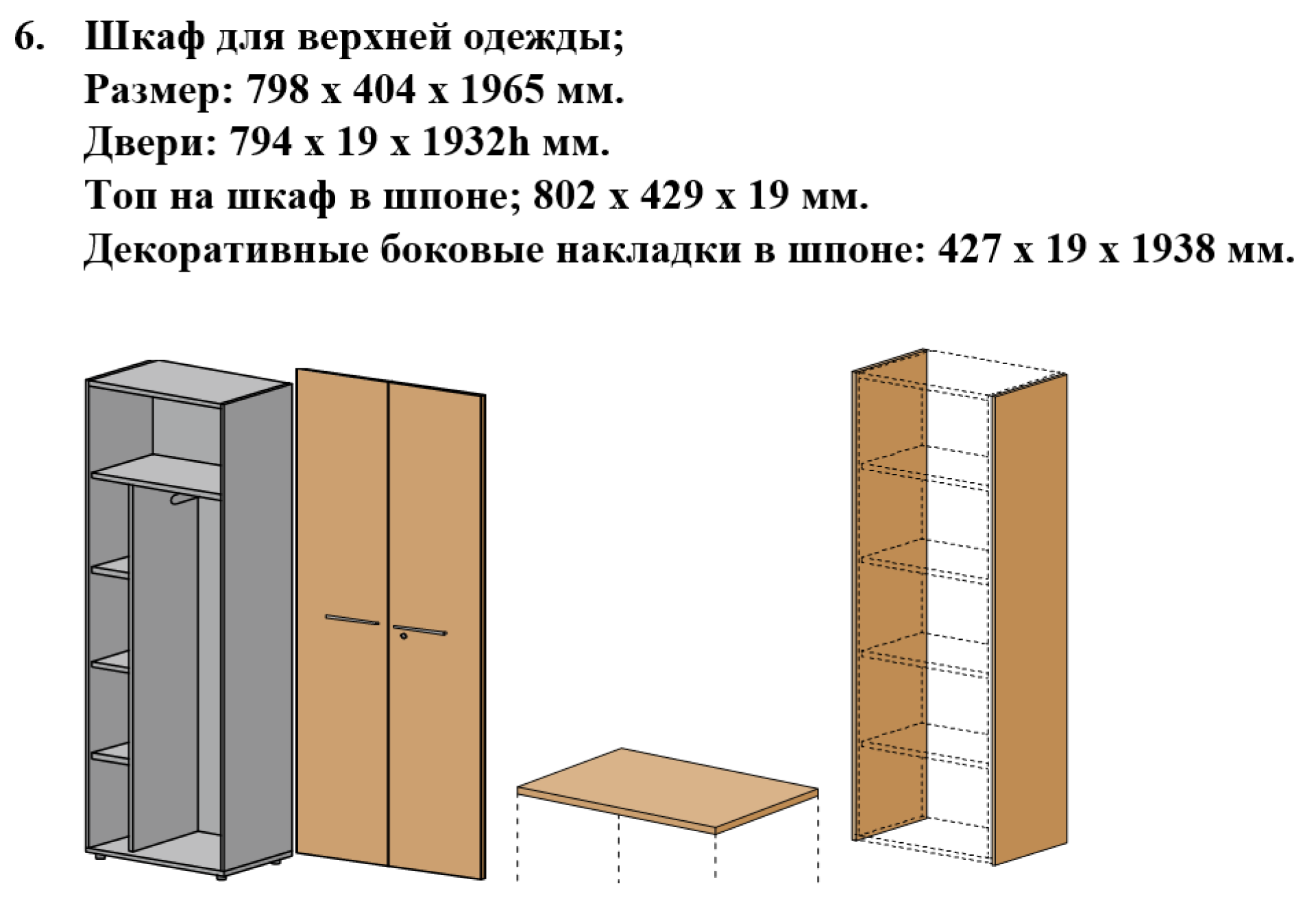 Судя по той техспецификации, речь шла о базовой офисной мебели: в каждый набор входили стол, мобильная тумба, шкафы для документов и для одежды, а материалы ограничивались ЛДСП — без каких-либо требований по коже, шпону или фурнитуре.