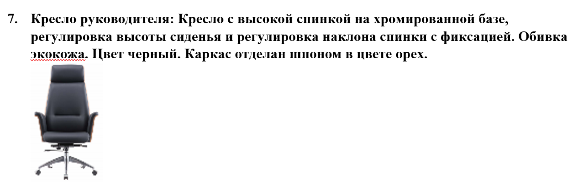 Каркас должен быть выполнен из фанеры и облицован экокожей, а задняя спинка — отделана фанерой в шпоне. Референс для этих кресел также имеется, но выглядит немного странно — больше напоминает просто фотографию, вставленную в документ.