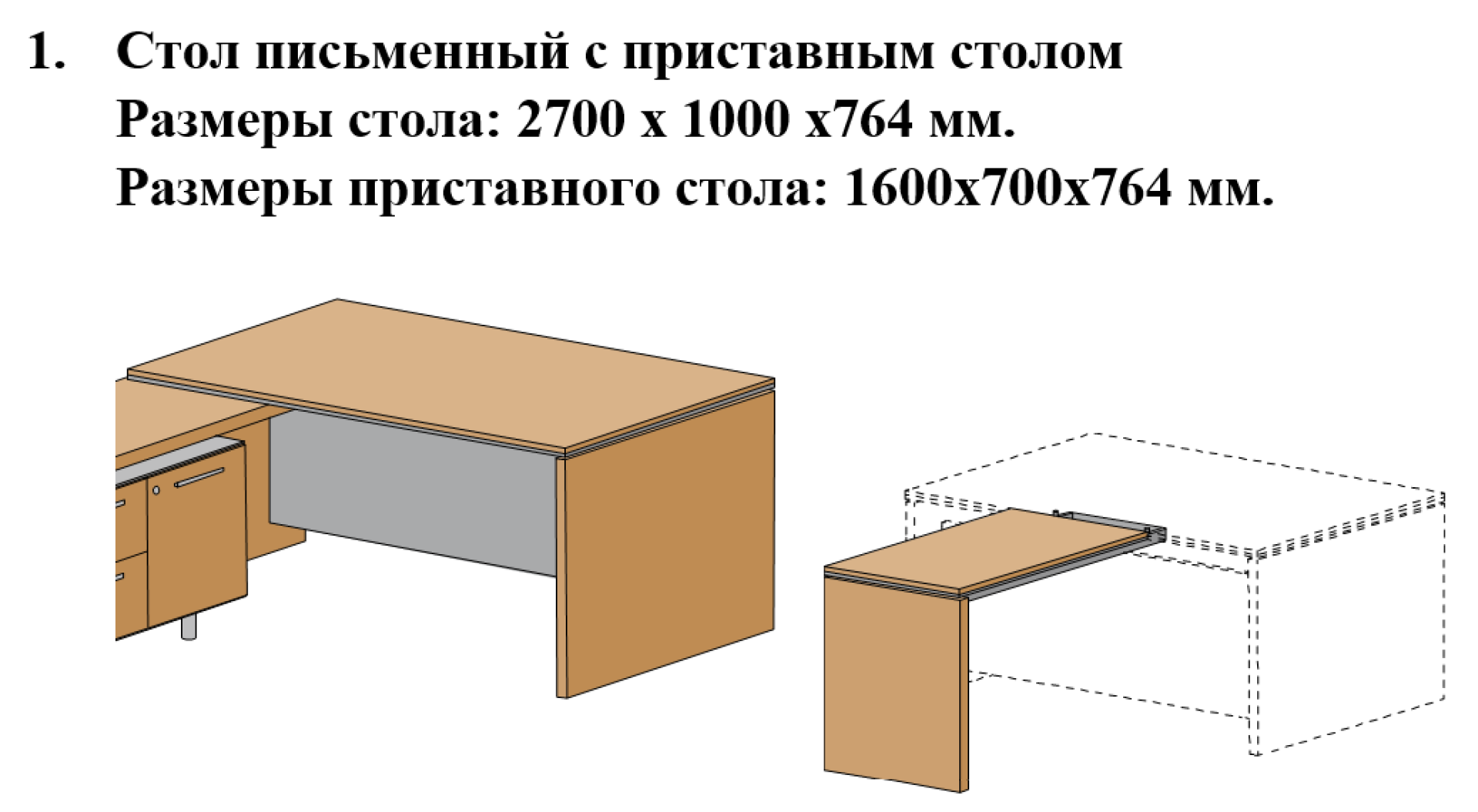 Так, например, в техспецификации упоминается письменный стол с приставной столешницей длиной в 2,7 метра и его описание заслуживает дословных цитат: