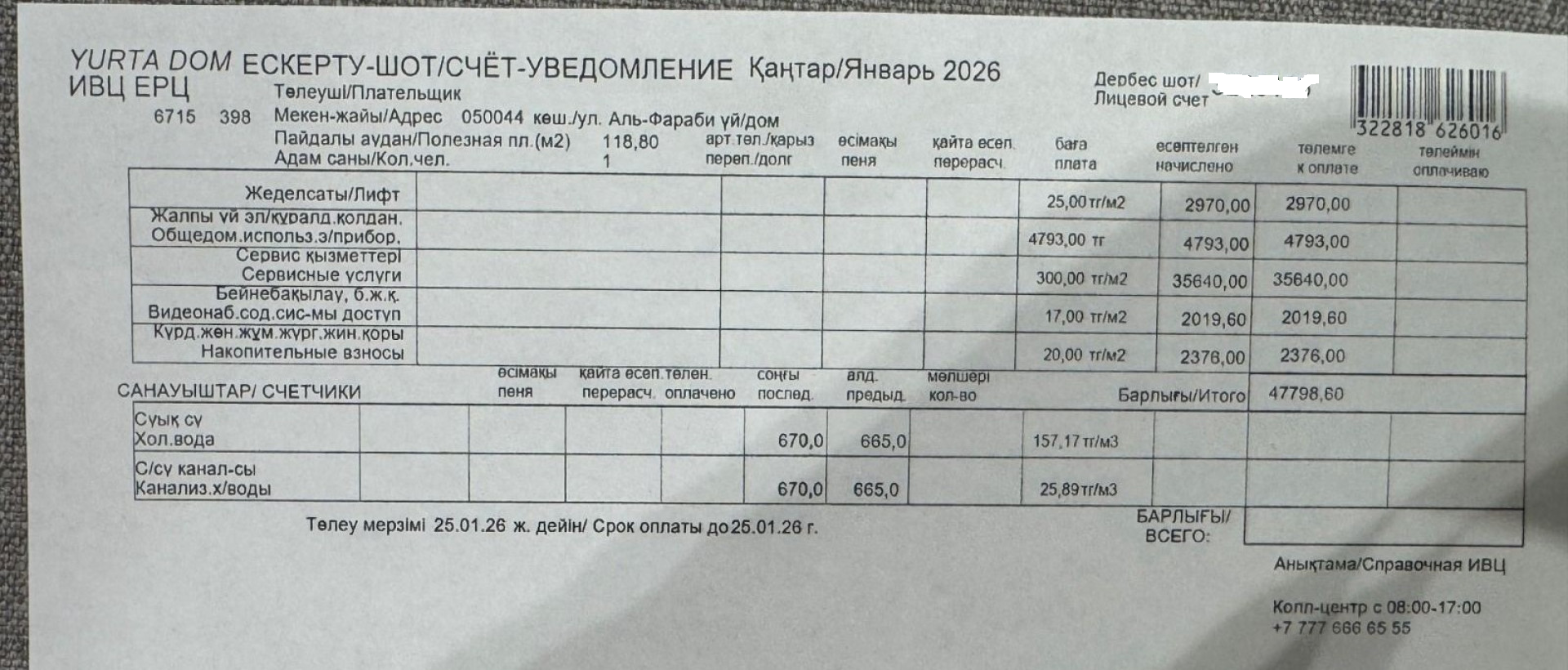 Любопытно также, во сколько обойдётся содержание жилья такой площади. Читатель Tengrinews.kz согласился поделиться счётом за "коммуналку" за квартиру в Esentai City площадью 118,8 квадратного метра. Там прописан один человек и только за содержание дома (не считая электроэнергии, воды, канализации, отопления) выходит почти 48 тысяч тенге в месяц.