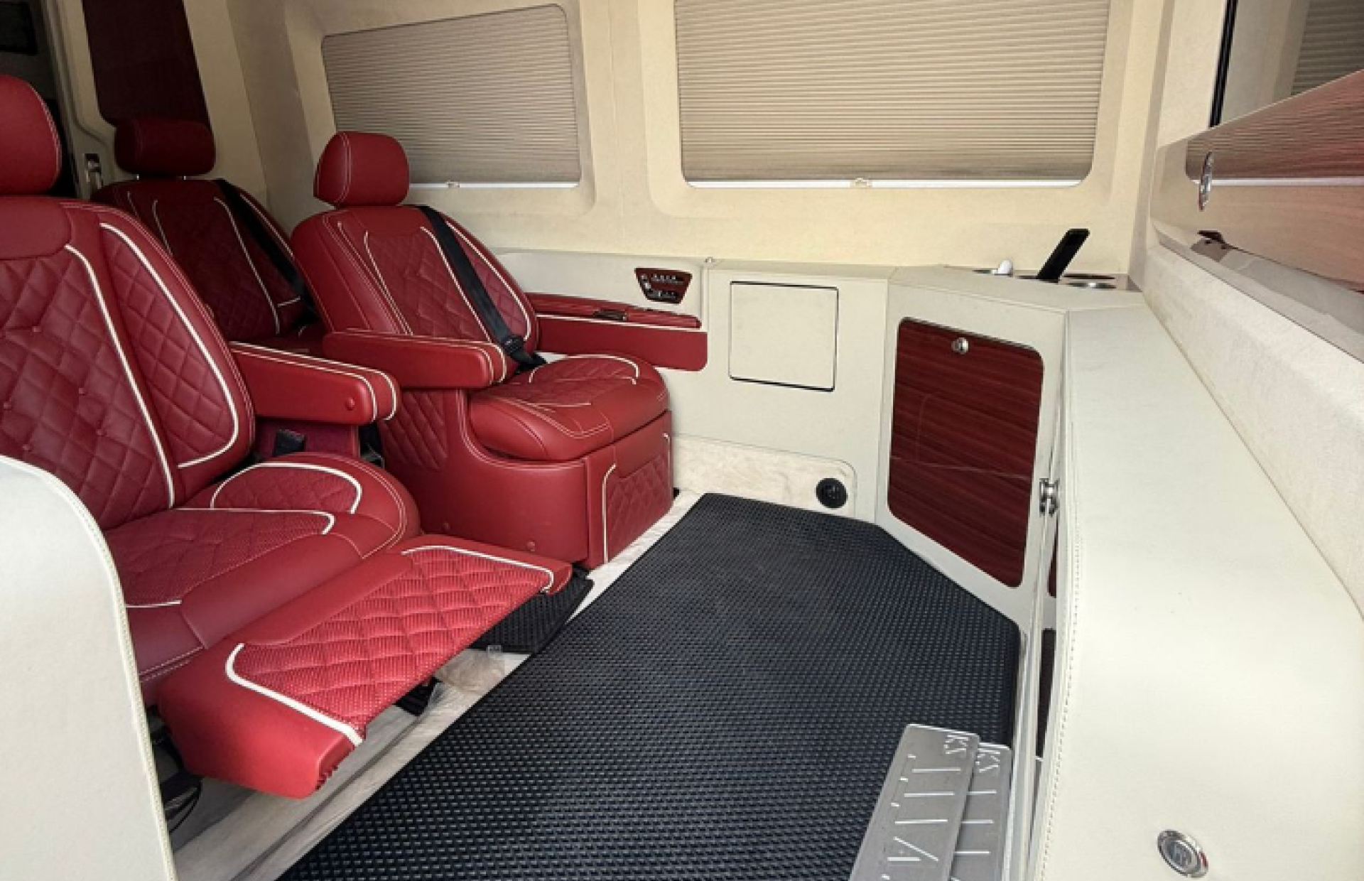 Салон микроавтобуса больше напоминает миниатюрный вип-лаунж: отдельные кожаные кресла с выраженной боковой поддержкой, ромбовидной прострочкой, подлокотниками и встроенными подстаканниками. Деревянные панели, закрытые модули хранения и перегородки намекают на наличие мини-барной или сервисной зоны.