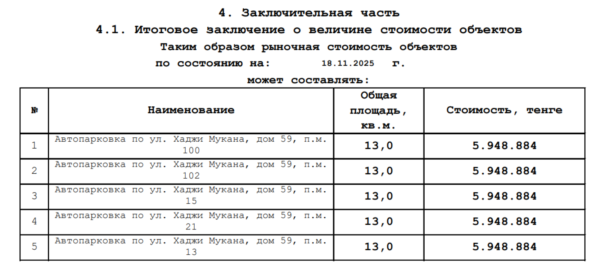 Всего парковочных мест, принадлежавших Коспаеву, пять. Их номера: 13, 15, 21, 100 и 102. Площадь каждого из них всего 13 квадратных метров. Но каждое стоит почти шесть миллионов тенге. Суммарно они оцениваются в 29,7 миллиона тенге.