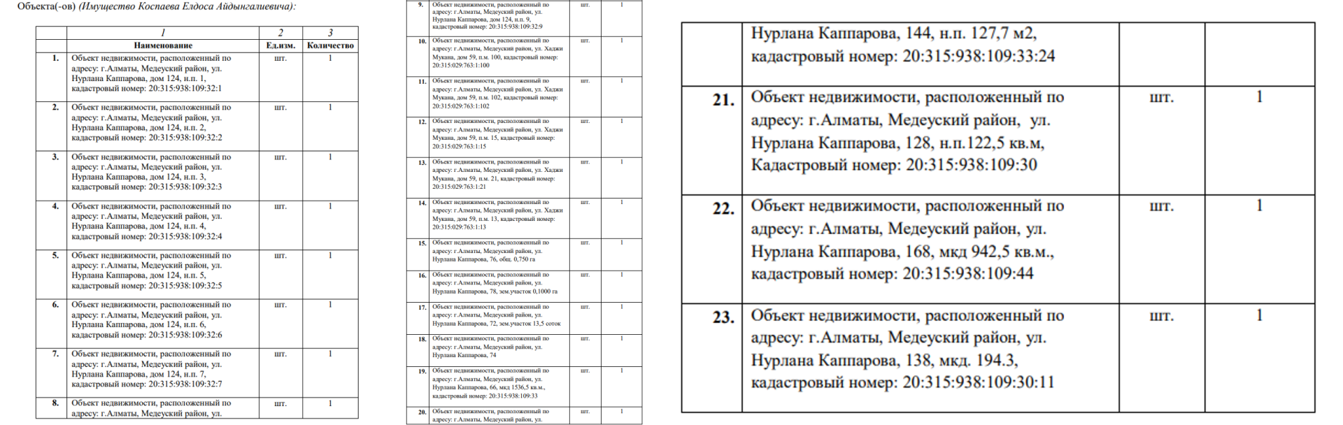 И тут самое интересное: кому именно принадлежала 21 квартира в элитном жилом комплексе? Ответ кроется в приложении к договору об оценке. Там указано, что вся недвижимость была конфискована у некоего "Коспаева Е.А".